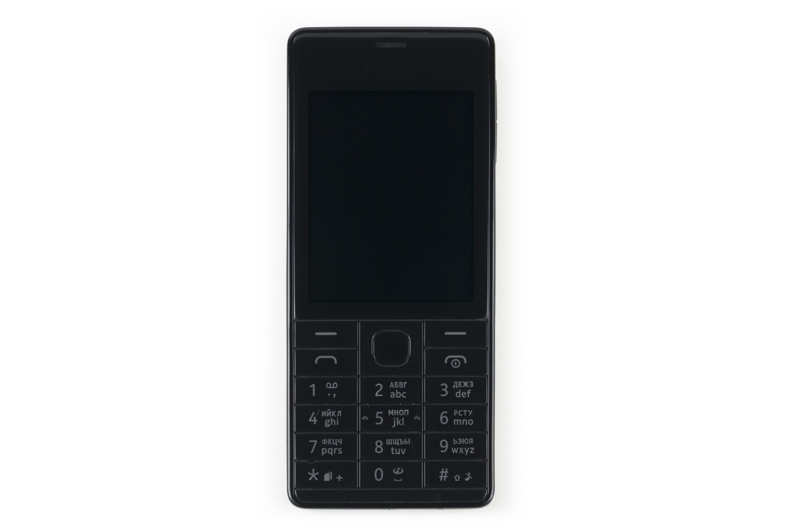 Клавиатура Nokia 515 занимает меньшую часть фронтальной панели, но за счет того, что кнопки размещены вплотную друг к другу, они имеют весьма крупный размер. Клавиши изготовлены из прозрачного пластичного полимера, обозначения нанесены непосредственно под ним, что исключает риск стирания. Для удобства слепой печати кнопка «5» имеет бугорки с двух сторон.