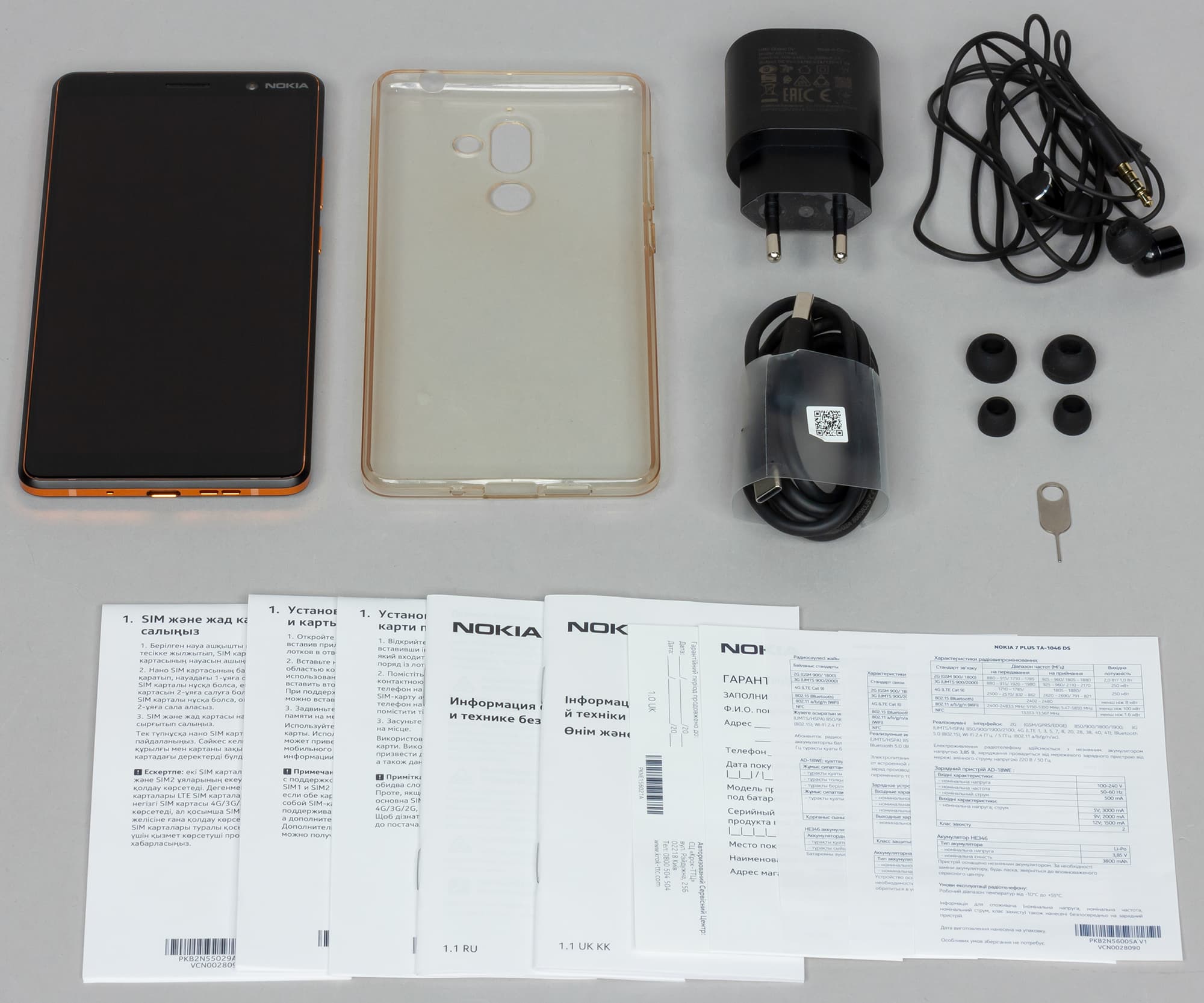 Богатая комплектация Nokia 7 Plus включает: USB-кабель, сетевой адаптер с поддержкой быстрой зарядки (5/9/12 В; 3/2/1,5 А), полупрозрачный гибкий полиуретановый чехол, а также неплохие наушники с набором резиновых накладок и ключик для извлечения карт.