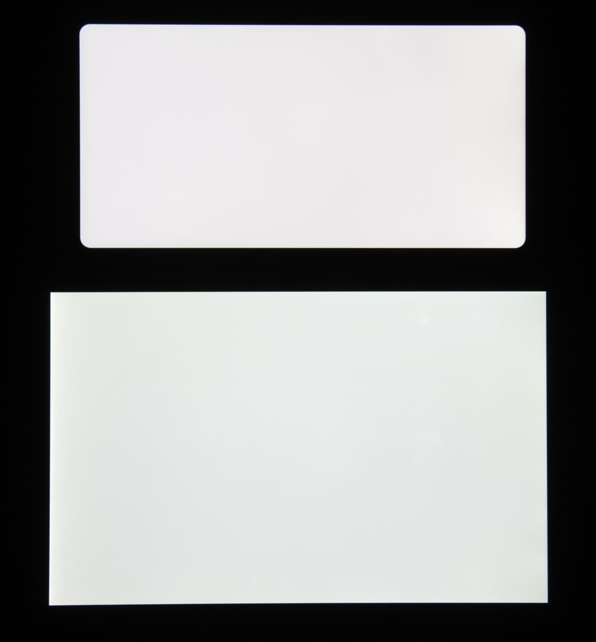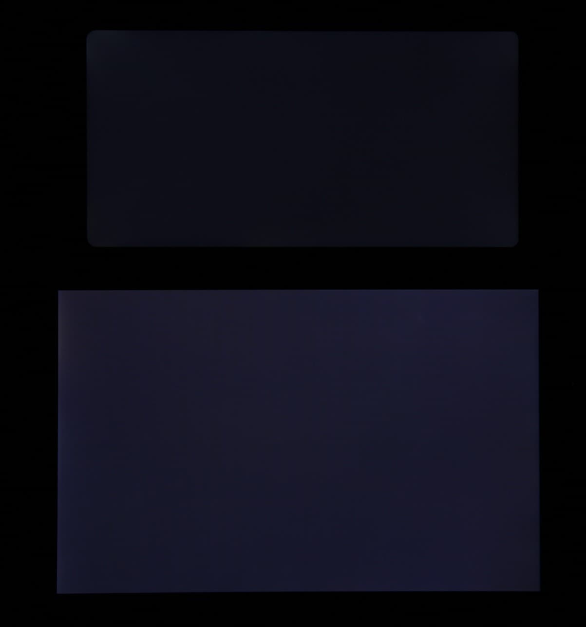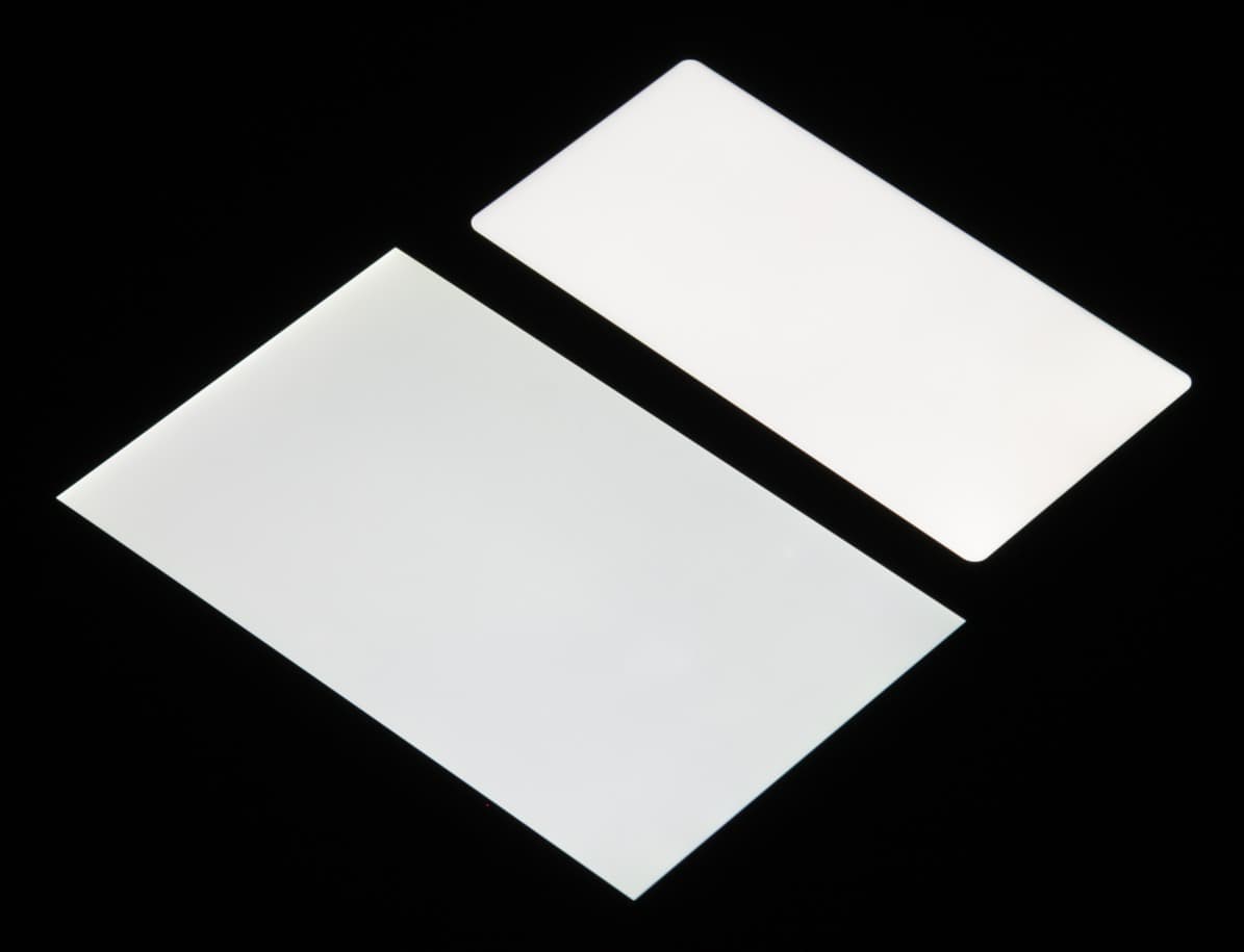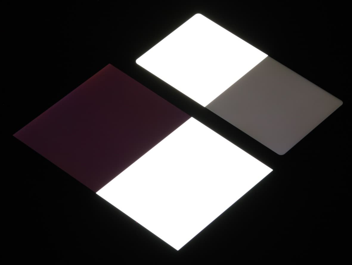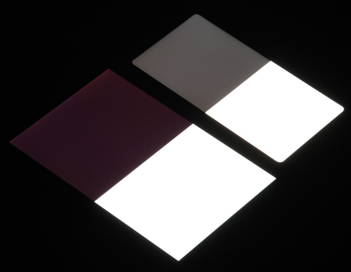Яркость под углом у экранов уменьшилась (как минимум в 4 раза, исходя из разницы в выдержке), но у Nokia 7 Plus экран все же немного светлее. Черное поле при отклонении по диагонали высветляется сильно, но остается условно нейтрально-серым. Фотографии ниже это демонстрируют (яркость белых участков в перпендикулярном плоскости экранов направлении одинаковая!):