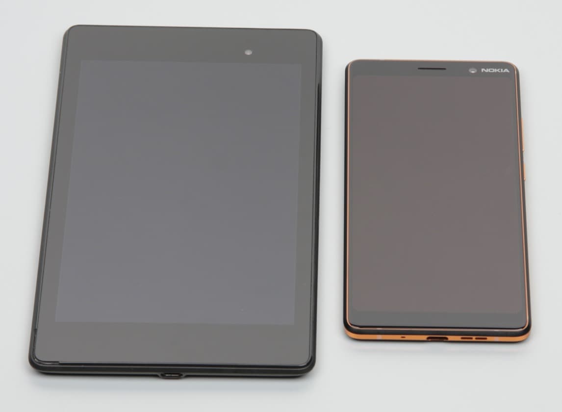 Лицевая поверхность экрана выполнена в виде стеклянной пластины с зеркально-гладкой поверхностью, устойчивой к появлению царапин. Судя по отражению объектов, антибликовые свойства экрана немного лучше, чем у экрана Google Nexus 7 (2013) (далее просто Nexus 7). Для наглядности приведем фотографию, на которой в выключенных экранах отражается белая поверхность (слева — Nexus 7, справа — Nokia 7 Plus, далее их можно различать по размеру):