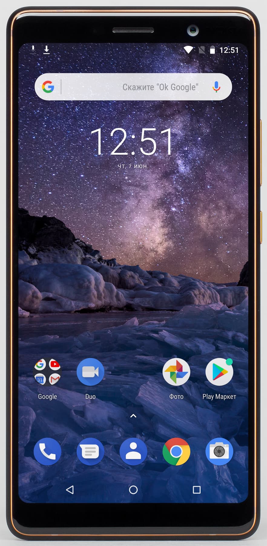 Передняя панель, к сожалению, не получила светодиодного индикатора событий, и это очень странно. Наверное, разработчик сделал ставку на работу функции оповещения в монохромном режиме. Это не технология Always On Display, но что-то наподобие нее: срабатывает, когда берешь аппарат в руку, показывает время, текущую дату и пропущенные события — такое в Nokia было всегда.