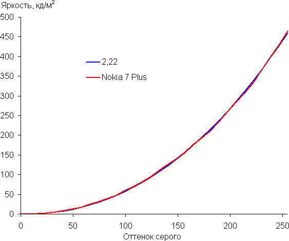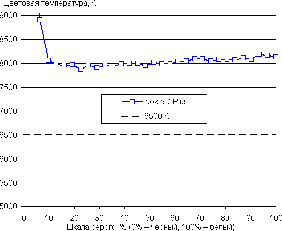 Баланс оттенков на шкале компромиссный, так как цветовая температура существенно выше стандартных 6500 К, но отклонение от спектра абсолютно черного тела (ΔE) ниже 10, что для потребительского устройства считается приемлемым показателем. При этом цветовая температура и ΔE мало изменяются от оттенка к оттенку — это положительно сказывается на визуальной оценке цветового баланса. (Самые темные области шкалы серого можно не учитывать, так как там баланс цветов не имеет большого значения, да и погрешность измерений цветовых характеристик на низкой яркости большая.)
