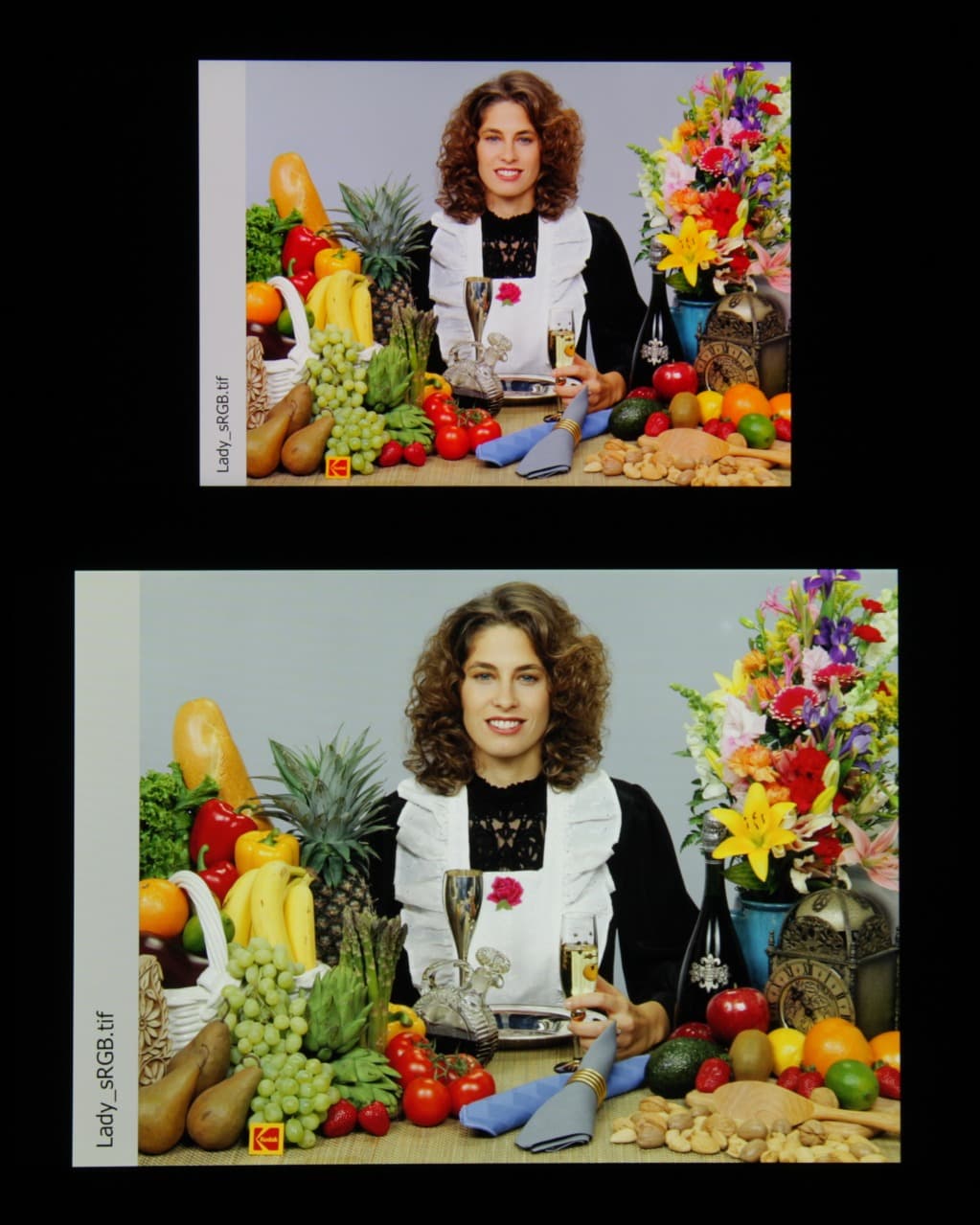 Спектры компонент хорошо разделены, что и обуславливает широкий цветовой охват. Такое мы уже видели в случае, например, Sony Xperia Z2 и других мобильных устройств. Sony указывает, что в этих экранах используются светодиоды с синим излучателем и зеленым и красным люминофором (обычно — синий излучатель и желтый люминофор), что в сочетании со специальными светофильтрами матрицы и позволяет получить широкий цветовой охват. Да, и в красном люминофоре, видимо, используются так называемые квантовые точки. Для потребительского устройства широкий цветовой охват является никак не достоинством, а существенным недостатком, поскольку в итоге цвета изображений — рисунков, фотографий и фильмов, — ориентированных на пространство sRGB (а таких подавляющее большинство), имеют неестественную насыщенность. Особенно это заметно на узнаваемых оттенках, например на оттенках кожи. Результат приведен на фотографиях выше.
