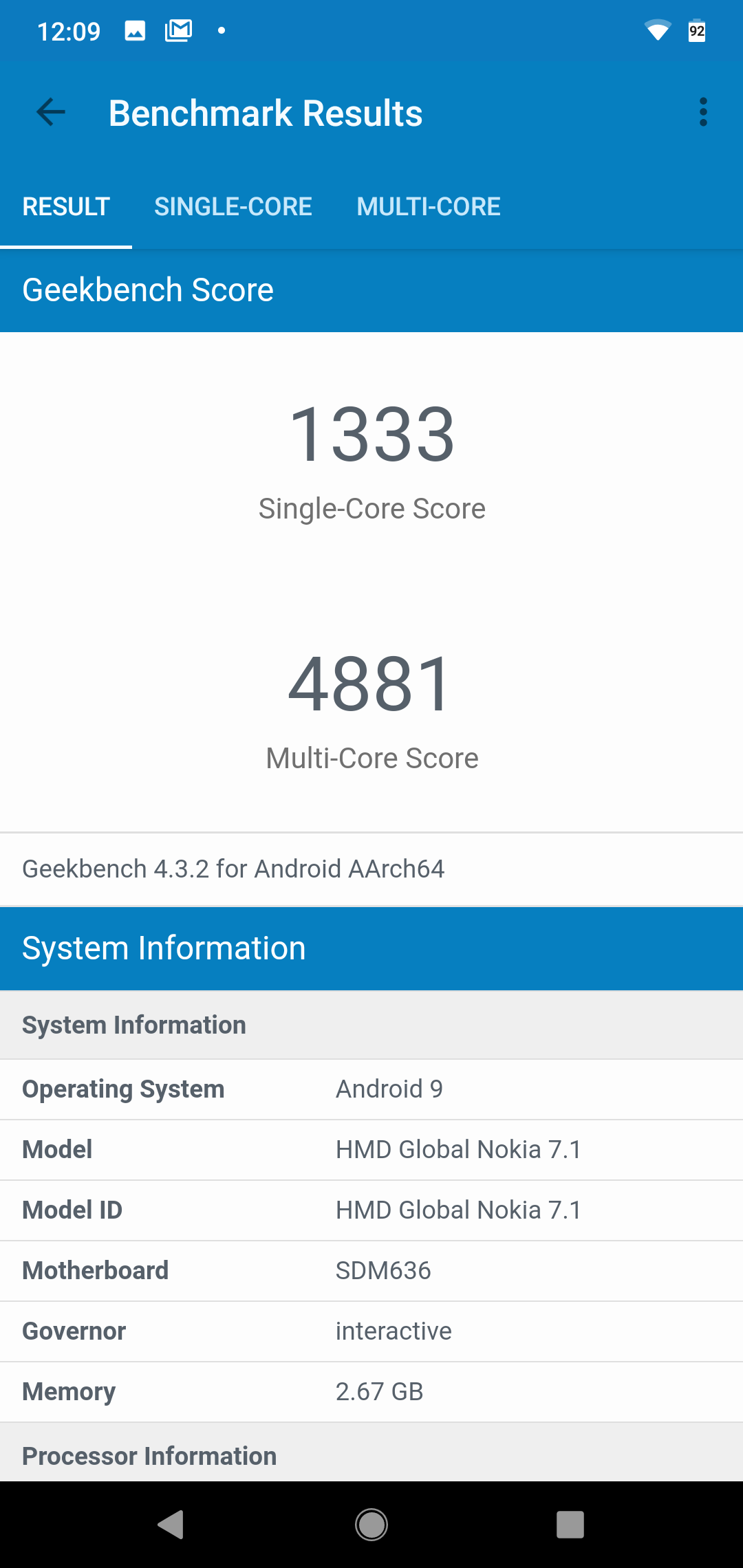 | Nokia 7.1 (Qualcomm Snapdragon 636) | moto g7 (Qualcomm Snapdragon 632) | Vivo V11 (Qualcomm Snapdragon 660) | Samsung Galaxy A7 (2018) (Samsung Exynos 7885) | Huawei P Smart 2019 (HiSilicon Kirin 710) | |