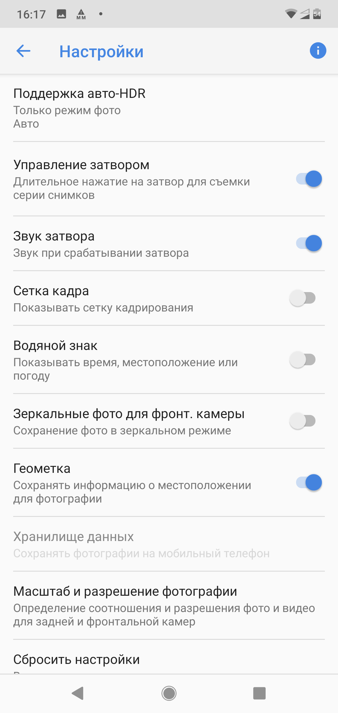Интерфейс перегруженный, много элементов выведено на центральный экран, а сверху одновременно расположили целых 8 иконок, о смысле которых все равно не догадаешься, пока не нажмешь каждую. Есть авто-HDR и режим с размытием фона. Штатной возможности сохранения снимков в RAW нет.