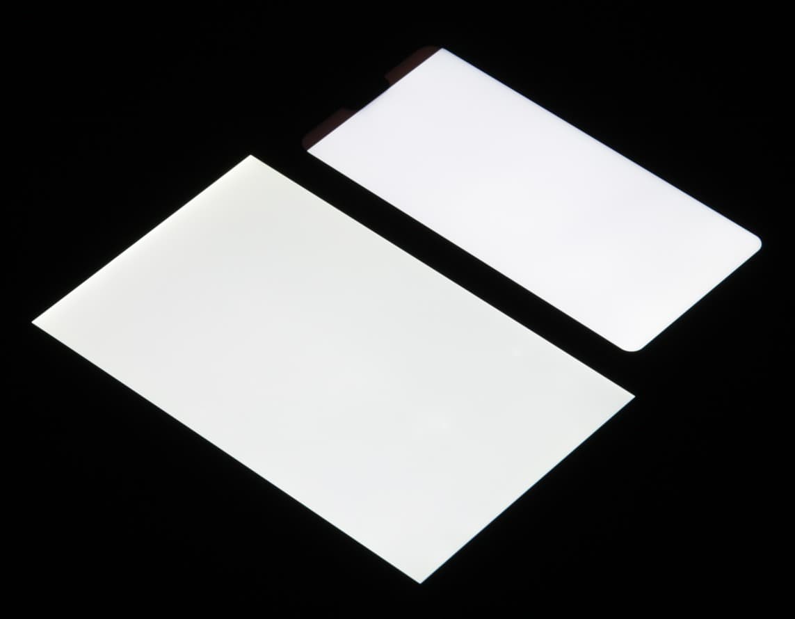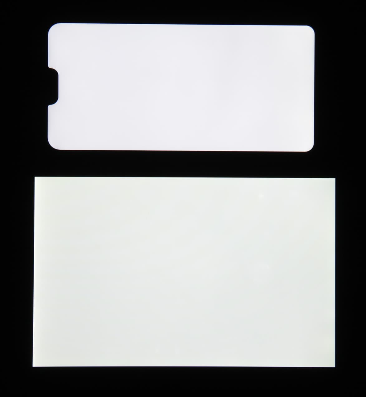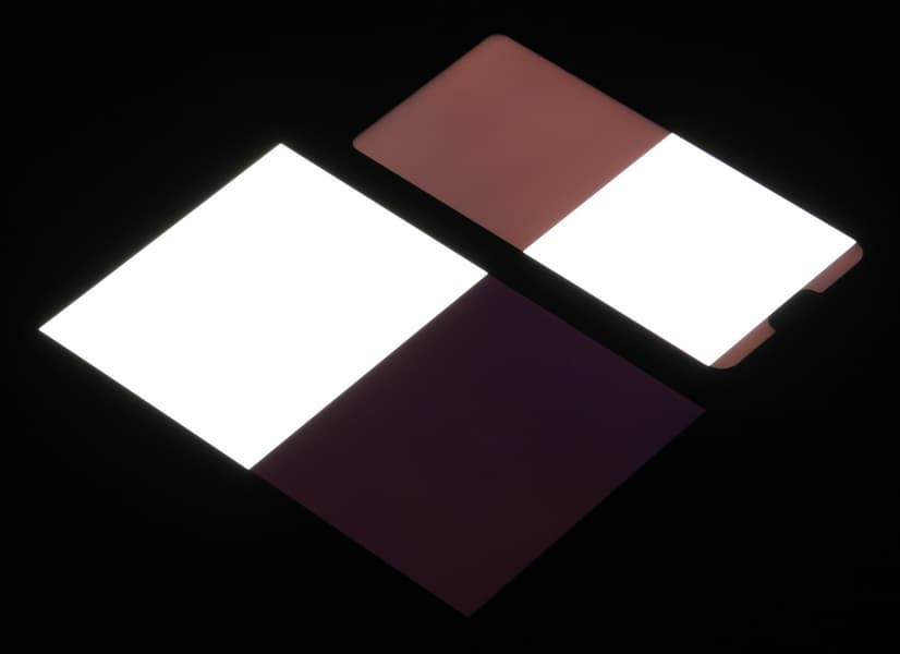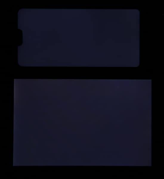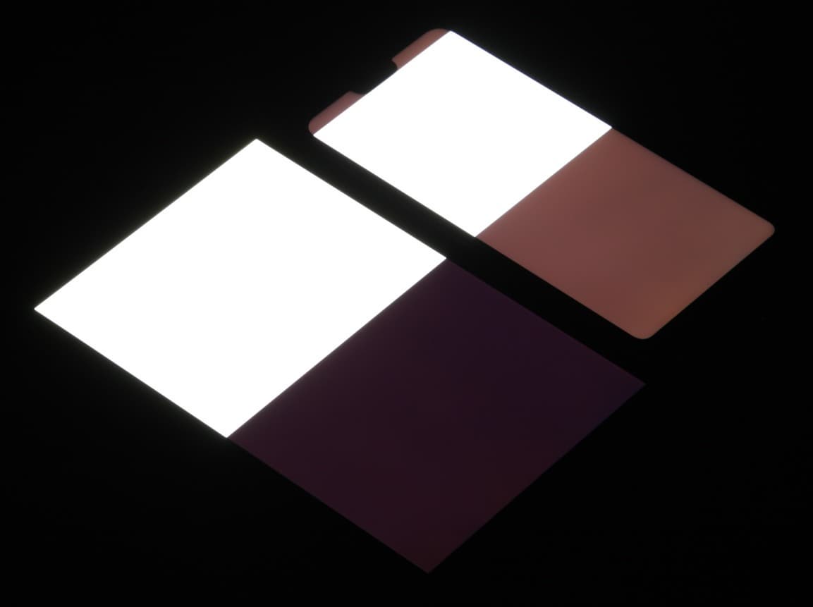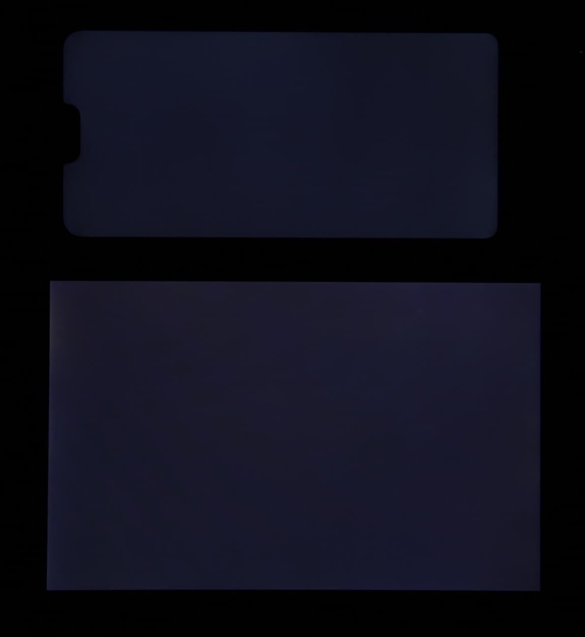 Яркость под углом у экранов уменьшилась (как минимум в 4 раза, исходя из разницы в выдержке), но у Nokia 7.1 экран все же немного светлее. Черное поле при отклонении по диагонали высветляется сильно, и приобретает красноватый оттенок. Фотографии ниже это демонстрируют (яркость белых участков в перпендикулярном плоскости экранов направлении одинаковая!):