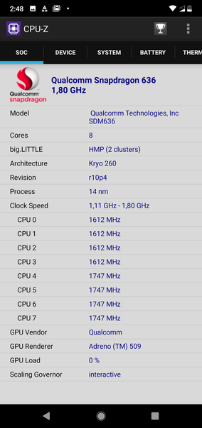 - SoC Qualcomm Snapdragon 636, 8 ядер Kryo 260 @1,6/1,8 ГГц