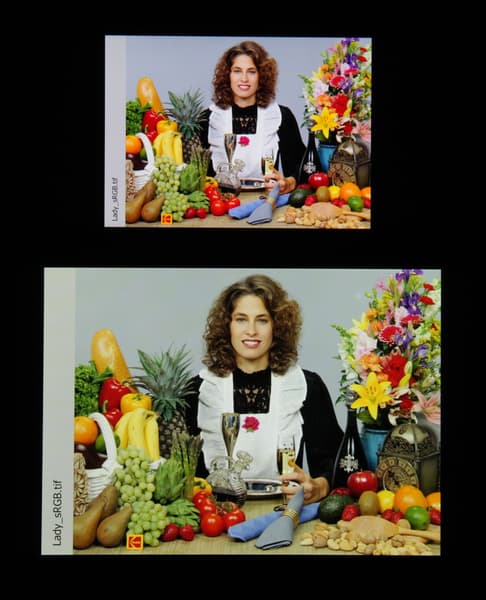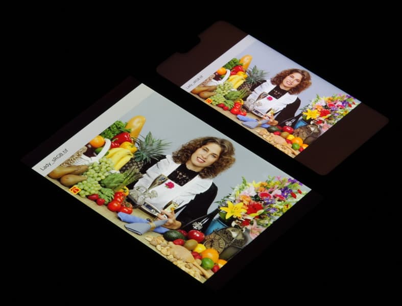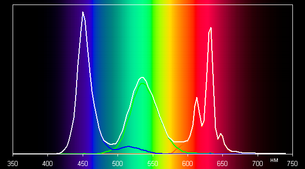 Спектры компонент хорошо разделены, что и обуславливает широкий цветовой охват. Для потребительского устройства широкий цветовой охват является никак не достоинством, а недостатком, поскольку в итоге цвета изображений — рисунков, фотографий и фильмов, — ориентированных на пространство sRGB (а таких подавляющее большинство), имеют неестественную насыщенность. Особенно это заметно на узнаваемых оттенках, например на оттенках кожи. Результат приведен на фотографиях выше.