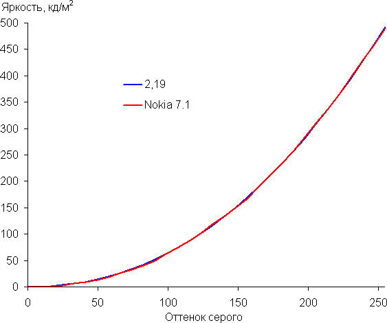 Контрастность (примерно в центре экрана) высокая — порядка 1200:1. Время отклика при переходе черный-белый-черный равно 23 мс (11 мс вкл. + 12 мс выкл.). Переход между полутонами серого 25% и 75% (по численному значению цвета) и обратно в сумме занимает 40 мс. Построенная по 32 точкам с равным интервалом по численному значению оттенка серого гамма-кривая не выявила завала ни в светах, ни в тенях. Показатель аппроксимирующей степенной функции равен 2,19, что очень близко к стандартному значению 2,2. При этом реальная гамма-кривая мало отклоняется от степенной зависимости:
