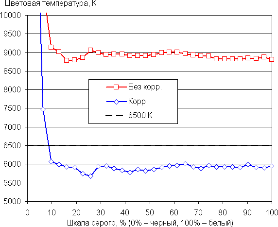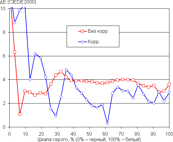 Баланс оттенков на шкале компромиссный, так как цветовая температура существенно выше стандартных 6500 К, но отклонение от спектра абсолютно черного тела (ΔE) ниже 10, что для потребительского устройства считается приемлемым показателем (зависимости Без корр. на графиках ниже). При этом цветовая температура и ΔE мало изменяются от оттенка к оттенку — это положительно сказывается на визуальной оценке цветового баланса. (Самые темные области шкалы серого можно не учитывать, так как там баланс цветов не имеет большого значения, да и погрешность измерений цветовых характеристик на низкой яркости большая.)