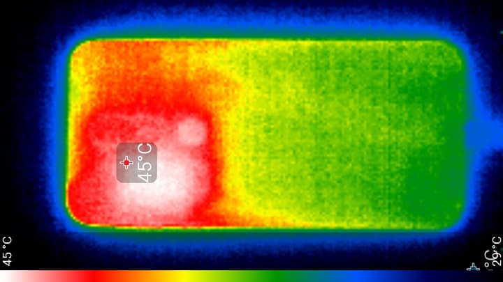 Нагрев больше локализован в верхней правой части аппарата, что, видимо, соответствует расположению микросхемы SoC. По данным теплокамеры, максимальный нагрев составил 45 градусов (при температуре окружающего воздуха в 24 градуса), это существенно выше среднего значения в данном тесте для современных смартфонов.