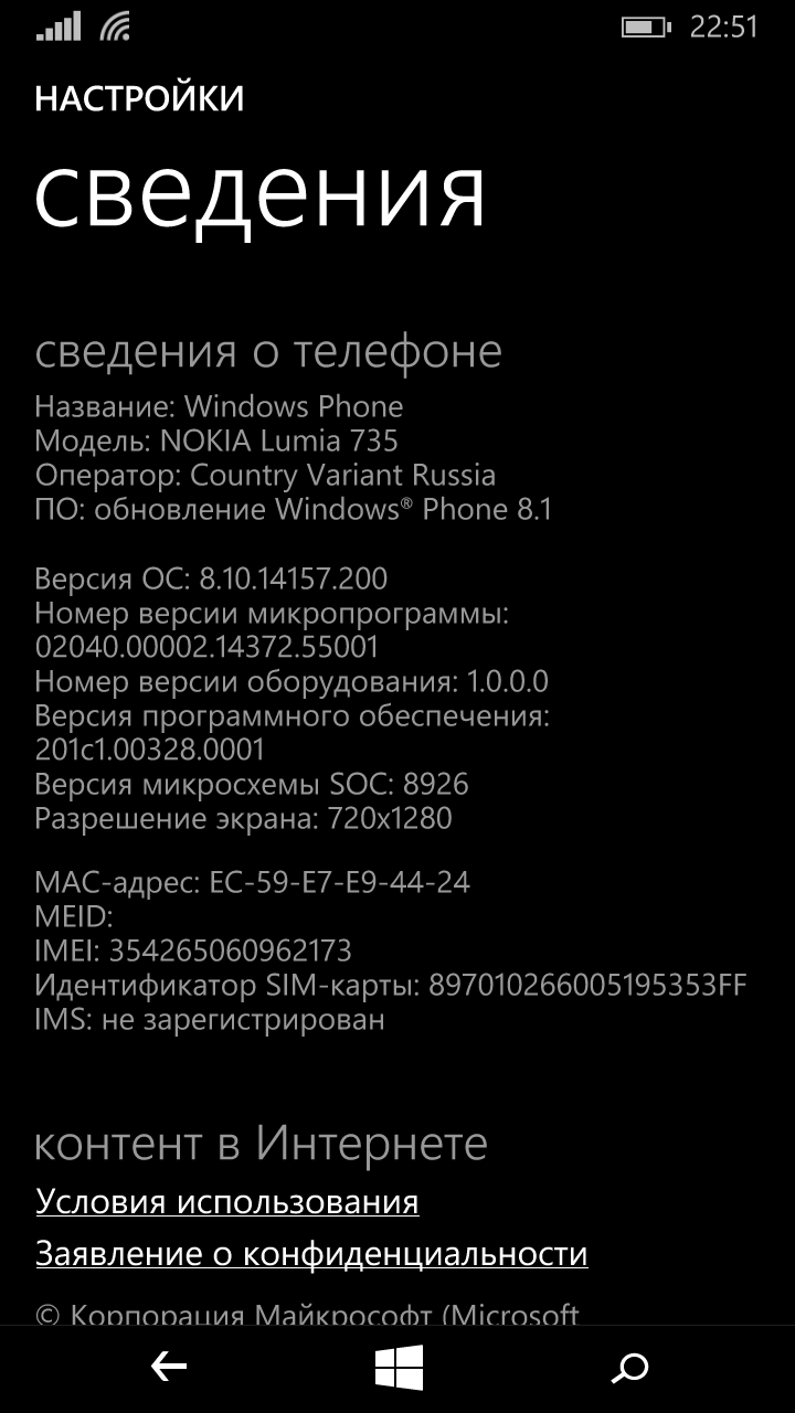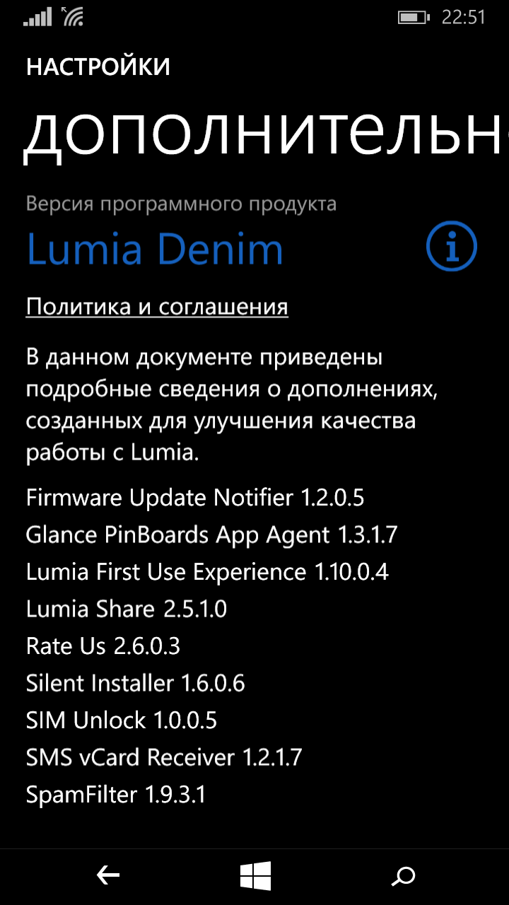 - Операционная система Microsoft Windows Phone 8.1 Update 1, пакет Lumia Denim