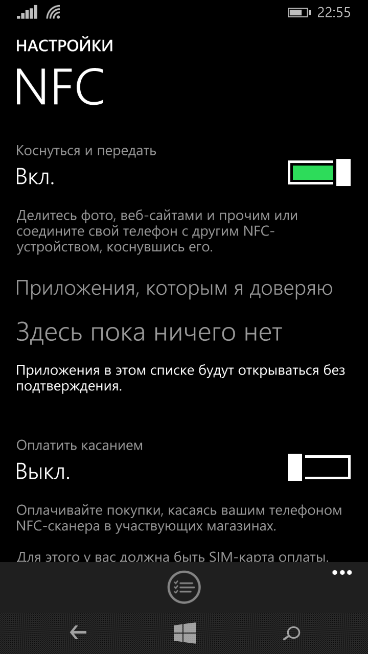 Смартфон Nokia Lumia 735 оснащен модулем NFC, антенна которого расположена с внутренней стороны сменной задней панели. Возможности его использования стандартны для данного класса устройств: считывание меток, обмен данными между устройствами, бесконтактные платежи (нужна особая SIM-карта).