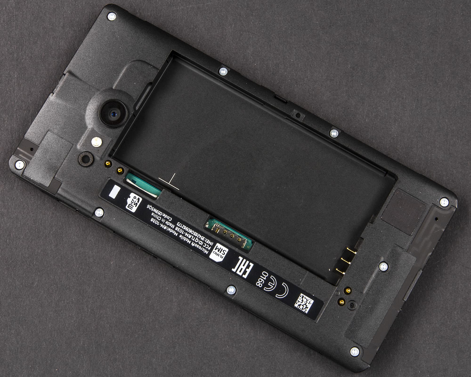 Внешний и внутренний корпуса разъединяются очень трудно, но с этой проблемой сталкиваешься только при замене карты памяти или SIM-карты. Если в случае Nokia Lumia 520, чья конструкция схожа с рассматриваемым смартфоном, для отсоединения крышки достаточно слегка надавить на объектив основной камеры, то у Nokia Lumia 730 приходится давить на него «что есть силы», при этом еще и прихватывая показавшийся внутренний корпус. Все дело в том, что крышка и внутренний корпус крепятся множеством защелок, которые, тем не менее, не избавили конструкцию от люфта. В итоге складывается впечатление, что в верхней части крышки с внутренней стороны не хватает наклейки-демпфера, а сама конструкция не переживет большое количество рассоединений.