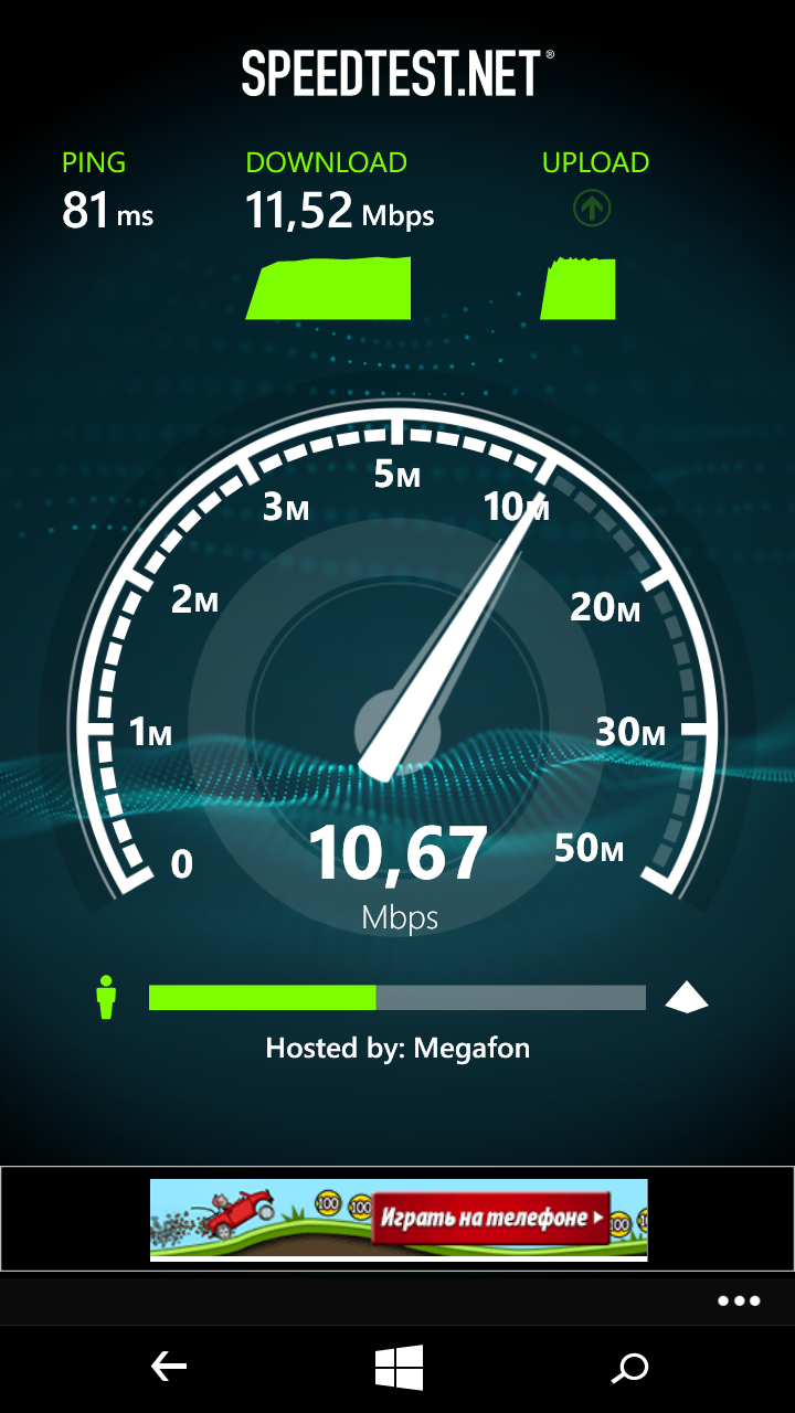 Мобильный компьютер успешно поймал сигнал сотовых сетей формата 3G и 4G в Москве и области. Скорость соединения не разочаровала и составила 12 Мбит/с.