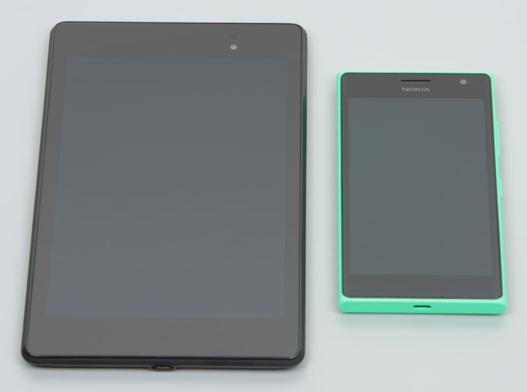Лицевая поверхность экрана выполнена в виде стеклянной пластины с зеркально-гладкой поверхностью, устойчивой к появлению царапин. Судя по отражению объектов антибликовые свойства экрана не хуже, чем у экрана Google Nexus 7 (2013) (далее просто Nexus 7). Для наглядности приведем фотографию, на которой в выключенных экранах отражается белая поверхность (слева — Nexus 7, справа — Nokia Lumia 735, далее их можно различать по размеру):