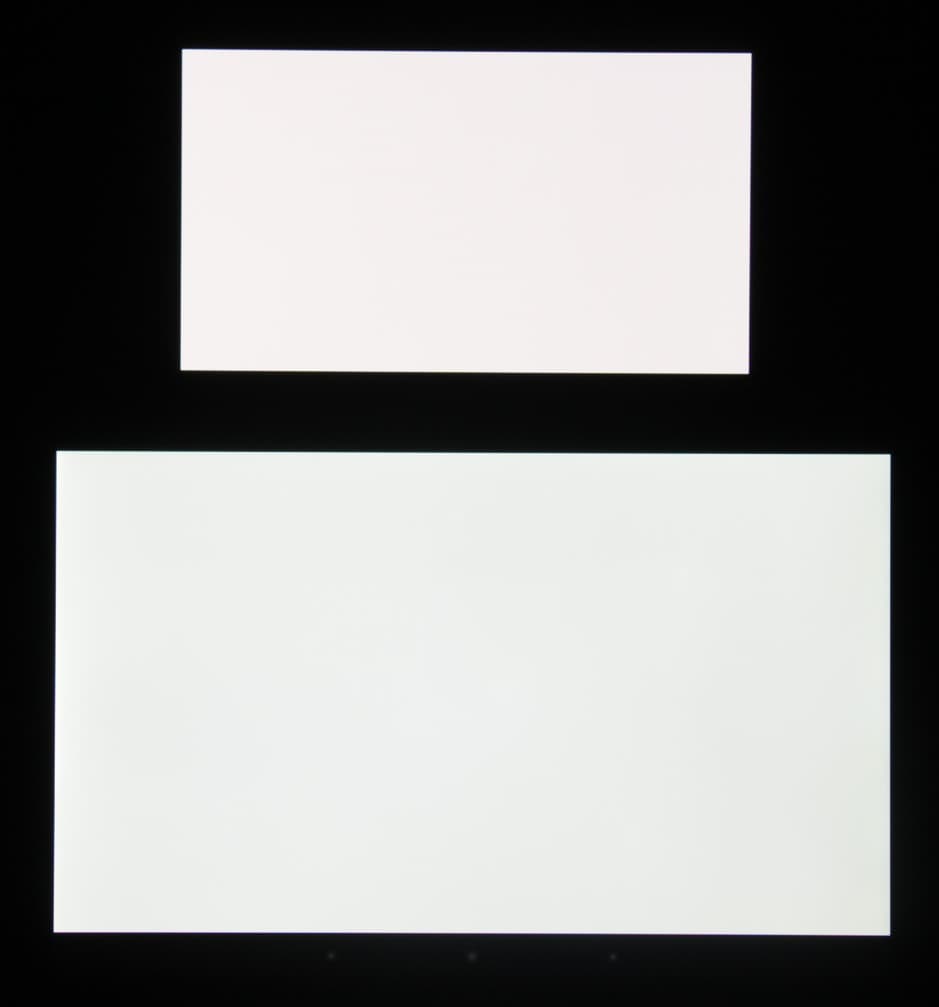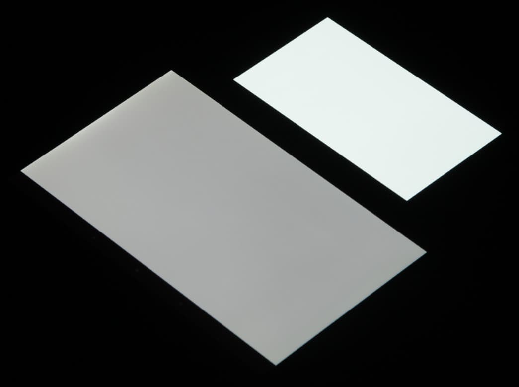 Экран характеризуется великолепными углами обзора, правда белый цвет при отклонении даже на небольшие углы приобретает легкий сине-зеленый оттенок, но черный цвет — просто черный под любыми углами. Настолько черный, что параметр контрастности в данном случае просто неприменим. При перпендикулярном взгляде равномерность белого поля отличная. Для сравнения приведем фотографии, на которых на экраны Nokia Lumia 735 (профиль стандартный) и второго участника сравнения выведены одинаковые изображения, при этом яркость экранов изначально установлена примерно на 200 кд/м², а цветовой баланс на фотоаппарате принудительно переключен на 6500 К. Белое поле: