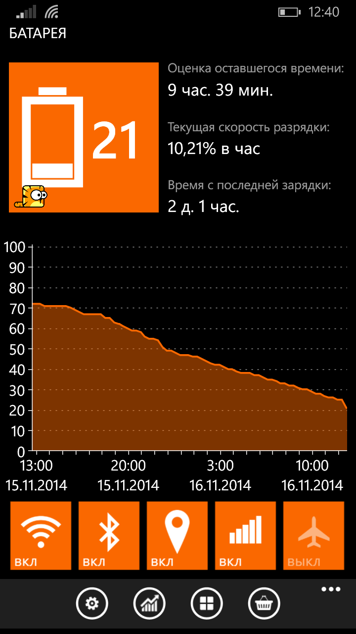 В режиме чтения Nokia Lumia 830 бьет все рекорды – почти сутки работы без подзарядки. При воспроизведении видео герой обзора уступил первенство своему старшему брату. В нескольких дополнительных тестах герой обзора продемонстрировал следующие результаты: GPS-навигация — 5,3 часа (со включенным модулем 3G/4G), проигрывание музыки — 48 часов, работа в обычном режиме — 2 дня.