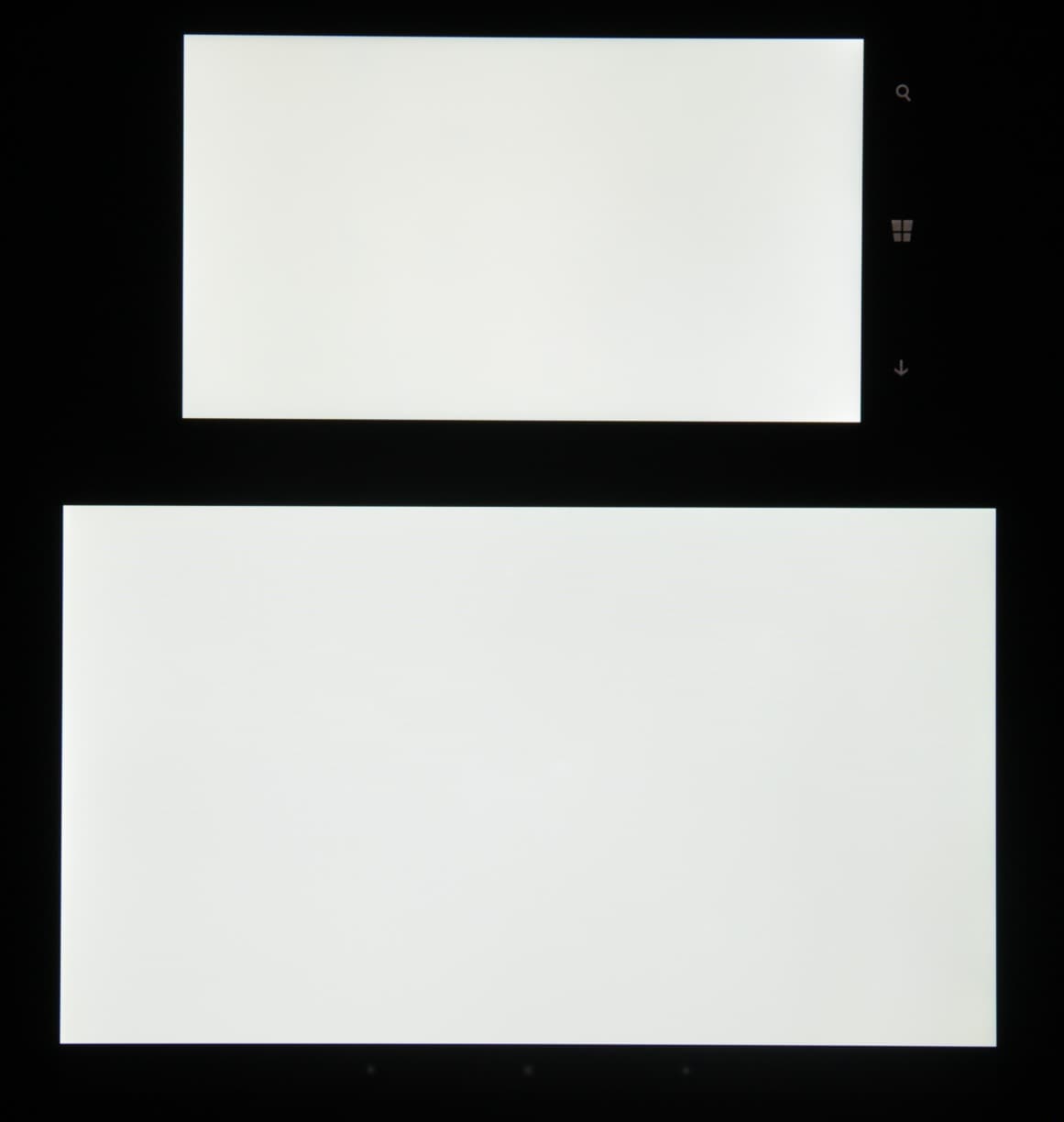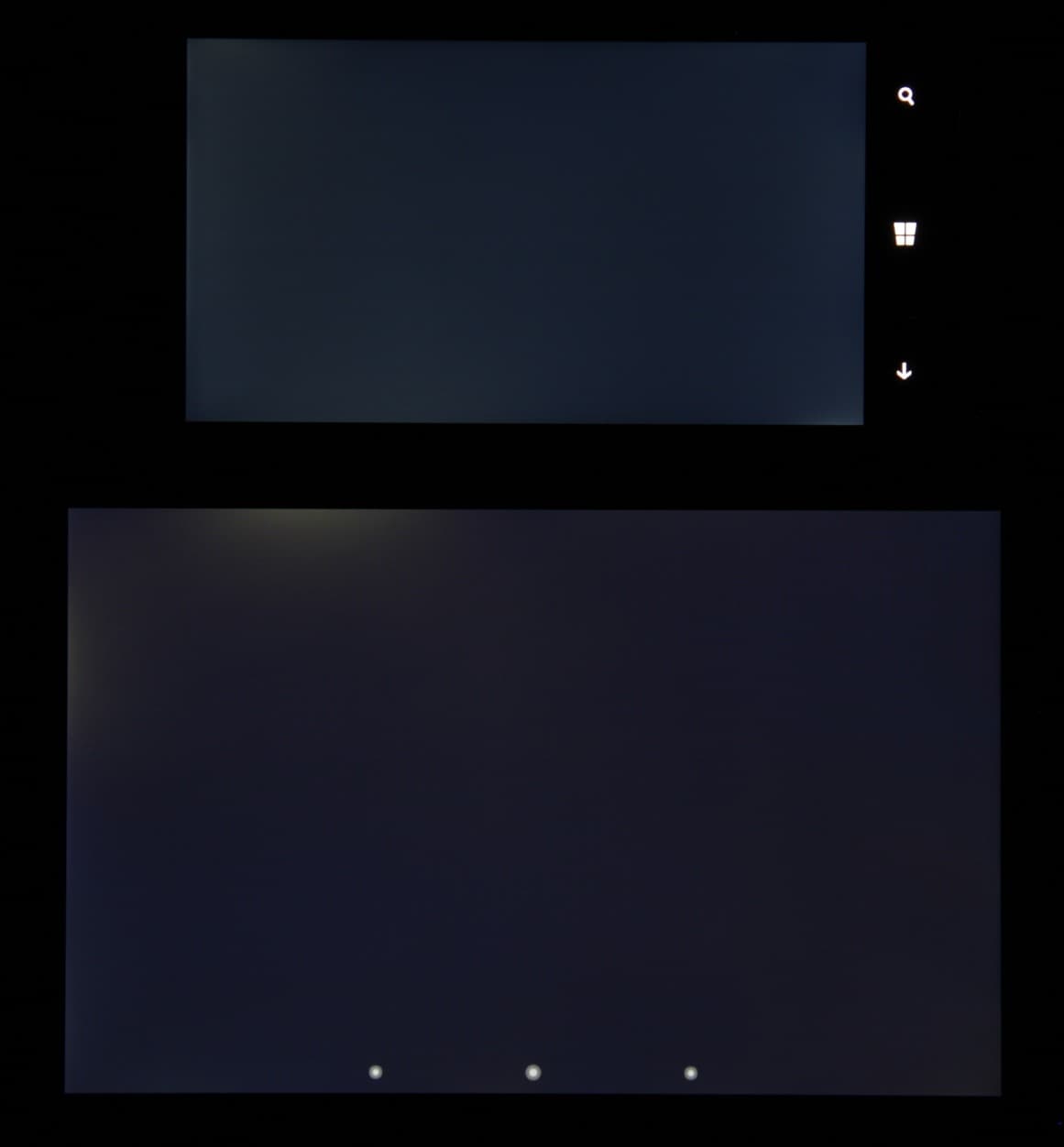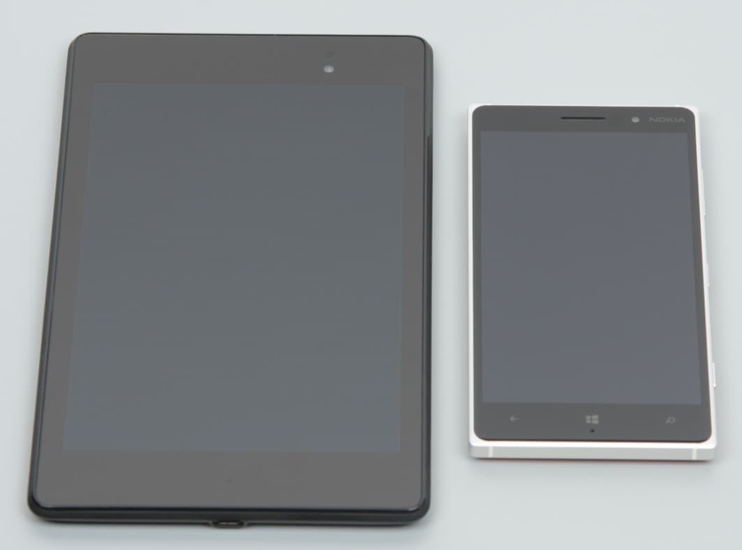 Лицевая поверхность экрана выполнена в виде стеклянной пластины с зеркально-гладкой поверхностью, устойчивой к появлению царапин. Судя по отражению объектов антибликовые свойства экрана не хуже, чем у экрана Google Nexus 7 (2013) (далее просто Nexus 7). Для наглядности приведем фотографию, на которой в выключенных экранах отражается белая поверхность (слева — Nexus 7, справа — Nokia Lumia 830, далее их можно различать по размеру):