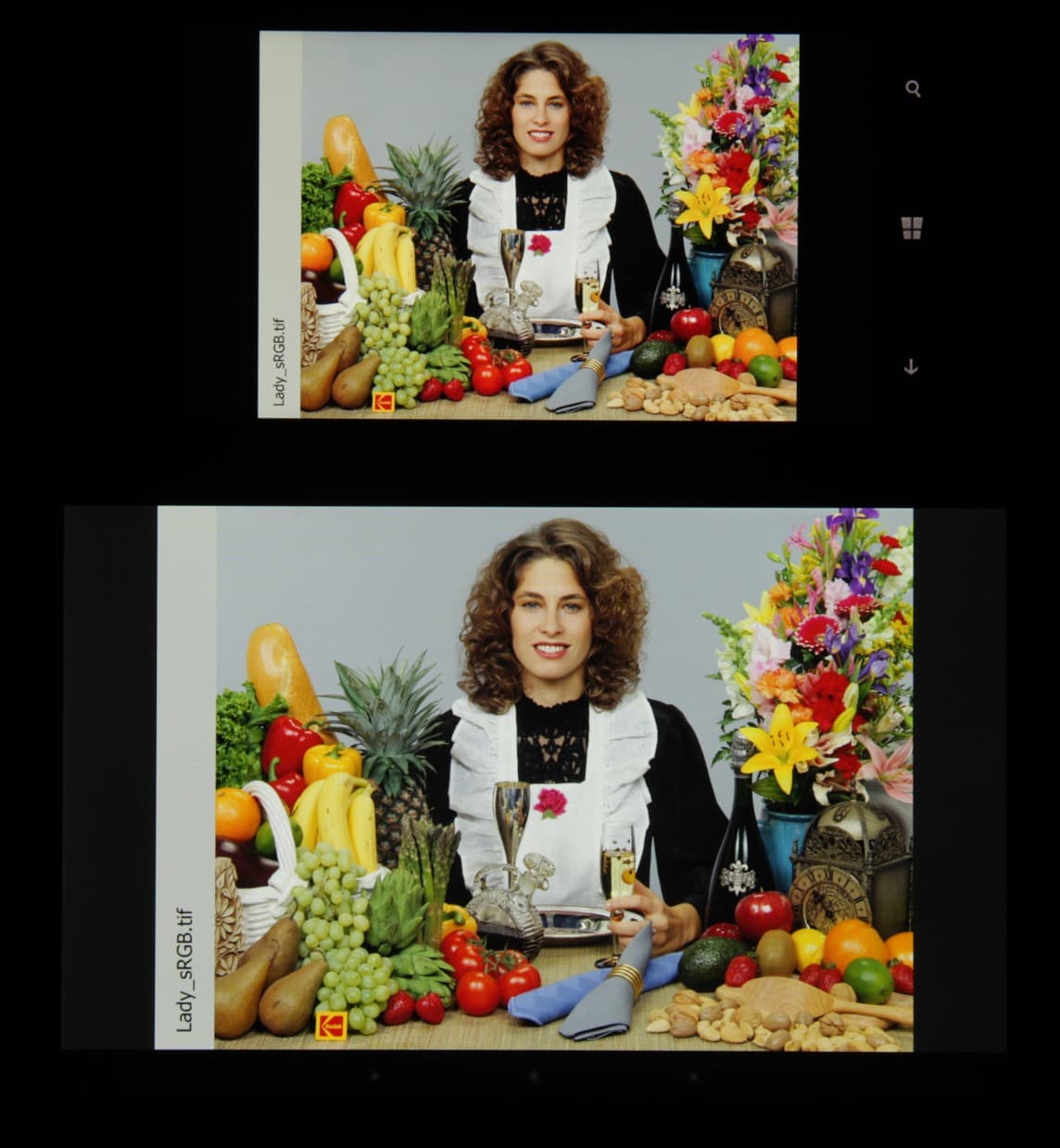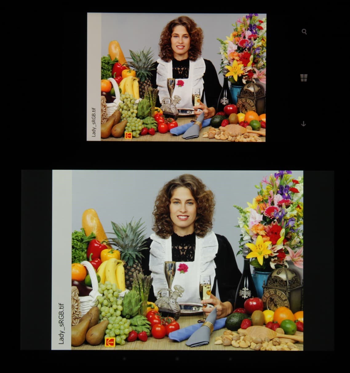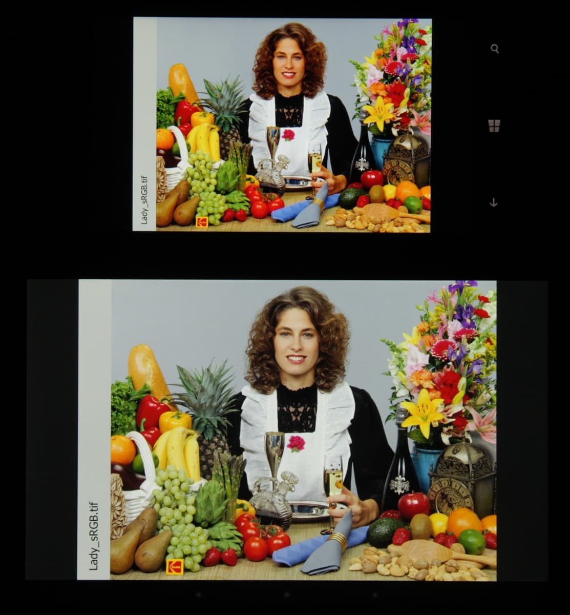 Цветопередача хорошая и цвета насыщенные у обоих экранов, цветовой баланс различается несущественно. Теперь под углом примерно 45 градусов к плоскости и к стороне экрана: