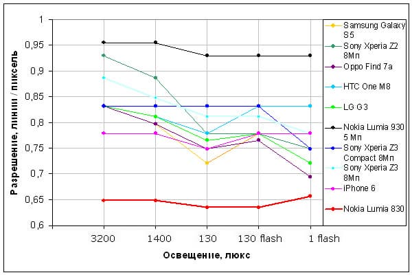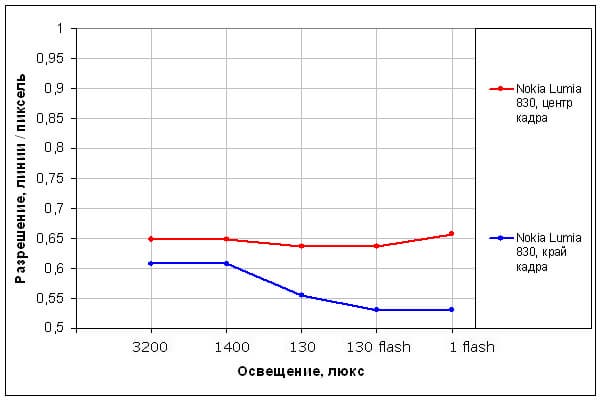 Это как раз тот случай, когда реальность и искусственный эксперимент немного расходятся. Несмотря на то, что разрешающая способность камеры довольно низкая, ей хорошо удаются детали. К тому же график демонстрирует неплохую стабильность при изменении освещения, что тоже дорогого стоит. Впрочем, это можно отметить и по полевым снимкам. Конечно, на 8 Мп все могло бы быть гораздо лучше, но и так достаточно неплохо, особенно для камеры смартфона.