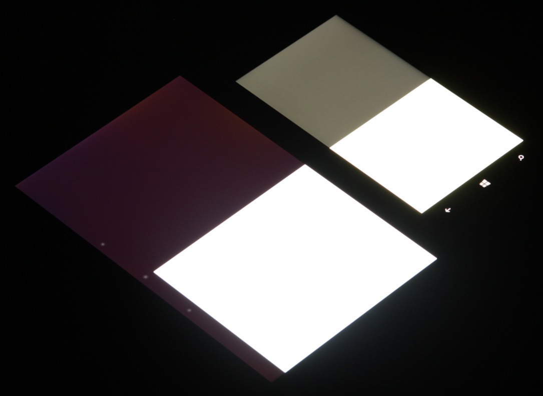 Яркость под углом у обоих экранов заметно уменьшилась (как минимум в 5 раз, исходя из разницы в выдержке), но в случае Nokia Lumia 830 падение яркости чуть меньше (яркость по фотографиям 233 против 229 у Nexus 7). Черное поле при отклонении по диагонали высветляется сильно и приобретает фиолетовый оттенок или остается примерно нейтрально-серым. Фотографии ниже это демонстрируют (яркость белых участков в перпендикулярном плоскости экранов направлении у экранов одинаковая!):