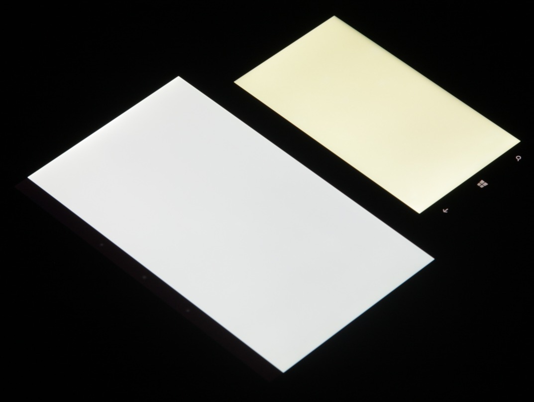 Экран имеет хорошие углы обзора без значительного сдвига цветов даже при больших отклонениях взгляда от перпендикуляра к экрану и без инвертирования (кроме самых-самых темных при отклонении взгляда влево) оттенков. Для сравнения приведем фотографии, на которой на экраны Nexus 7 и Nokia Lumia 830 выведены одинаковые изображения, при этом яркость экранов изначально установлена примерно на 200 кд/м² (по белому полю во весь экран), а цветовой баланс на фотоаппарате принудительно переключен на 6500 К. Перпендикулярно к плоскости экранов белое поле: