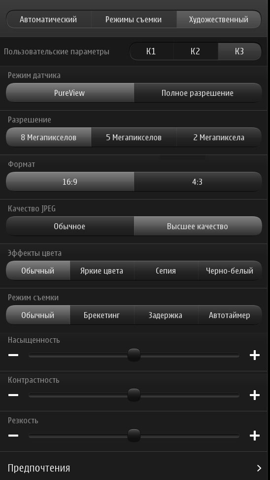 Художественный режим, который можно так же назвать Пользовательским, открывает много возможностей, недоступных большинству камерофонов. Есть возможность сохранить три набора собственных настроек, впоследствии доступных по кнопкам К1, К2 и К3.