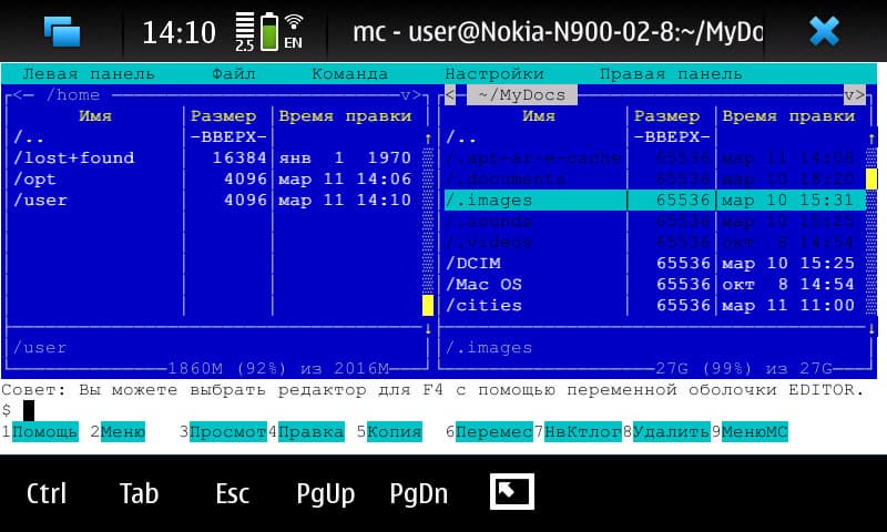 Из терминальной программы, с правами root, можно попасть в любое место файловой структуры N900. Но это, как ни крути, удобно и приятно только тем, кто очень к этому привык. Нормальный, рядовой пользователь хочет видеть, что и где у него в устройстве есть, раз уж имеется такая возможность, и хочет, чтобы видеть это ему было удобно. Встроенный файловый менеджер урезан, как обычно принято у Nokia, до возможности просматривать лишь пользовательские файлы — документы, музычка, картинки, ещё кое-что. Это доступ к пользовательскому разделу /home/user/MyDocs. А система вроде как открытая, да и может понадобиться поглядеть и в другие места, а то и вовсе там что-нибудь изменить, как мы увидим позже.