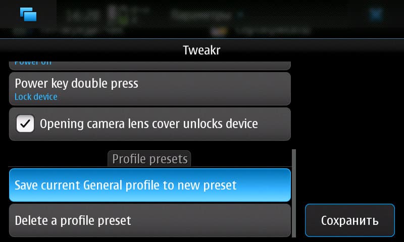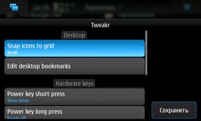 Стандартные настройки режимов в N900 сводятся к двум: «Общий» и «Без звука». Честно говоря, непонятно, для чего такой минимализм. Ну, считает кто-то, что ему двух профилей достаточно — пусть не пользуется функцией переключения на другие, зачем же ограничивать в создании новых всех остальных? Пока для решения этой проблемы есть только одна сторонняя разработка — «tweakr», которая, помимо профилей, занимается ещё кое-чем по подкручиванию системы, например, позволяет выстроить виджеты рабочих столов по сетке. Отчего Nokia сама не сделала ни того, ни другого? Идём в Extras, находим «tweakr», устанавливаем.