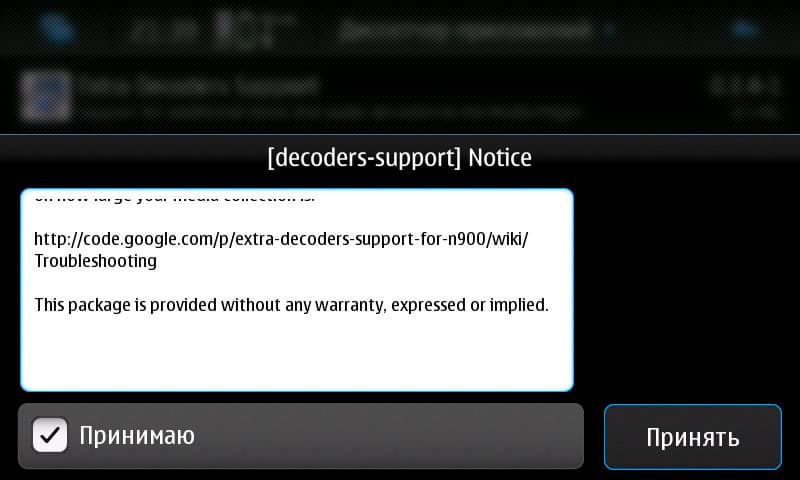 «Из коробки» этому аппарату категорически не хватает разнообразных кодеков, чтобы обеспечить своему пользователю внятное прослушивание _его_ музыки и _его_ фильмов, которые он где-то насобирал, сохранил, сколлекционировал... Поэтому в наш список «must have» попадает пакет «Extra Decoders Support», который даст аппарату поддержку FLAC, OGG, FLV, MKV, AC3 внутри видео, Musepack (.mpc) и ещё кое-что. Правда, на данный момент профили Main и High для H.264 не поддерживаются, поэтому многие видеофайлы в MKV воспроизводить девайс пока не научился, и ещё по мелочам. Но и без того всё очень неплохо.