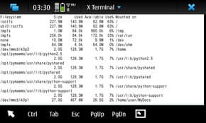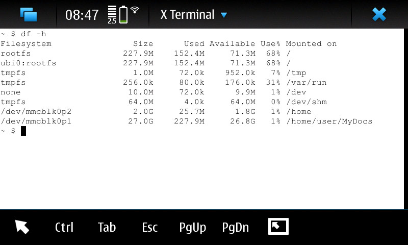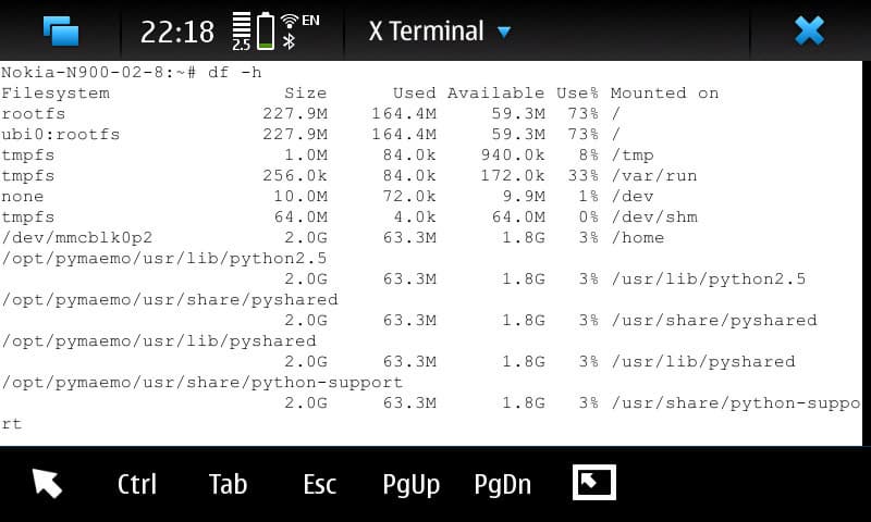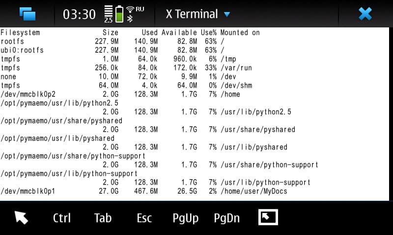 Запустим предустановленную программку «X Terminal», и наберём в ней «df -h», получим раскладку по использованию памяти в нашем N900. Особое внимание обратим на строку, описывающую состояние rootfs. Это мы себе так просто заметим, сколько свободного места там есть в полностью чистом, только что с прилавка аппарате. Вообще, rootfs — это системный раздел, в котором ничего лишнего быть не должно, а если и появляется, то появление это должно быть оправдано.