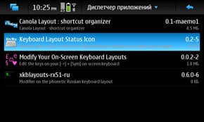После того, как репозиторий Extras-Devel добавится, можно поиском (по слову layout) в «Диспетчере приложений» найти нужную нам программу и установить её. После установки запускаем «X Terminal», набираем «pkill -f /usr/bin/hildon-status-menu» — это чтобы перезапустить не само устройство, а лишь статусную область.