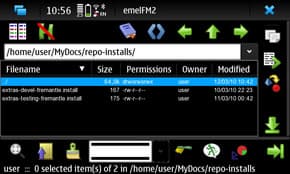 В репозиториях сейчас можно найти несколько альтернативных менеджеров, это «emelFM2», «GPE File manager» и «Midnight Сommander». Все они в Extras отсутствуют, в Testing есть только второй, в Devel есть ещё и «Midnight Commander», а «emelFM2» вообще берётся .deb файлом отсюда и сделан для предыдущих версий Maemo; в нём многое не рассчитано на N900, но может пригодиться. В общем-то, советуем установить все три, поскольку каждый из них может оказаться более удобным для каких-то определённых задач. И сразу скажем, ничего похожего на тот же «Xplore» для S60 на N900 пока не существует.