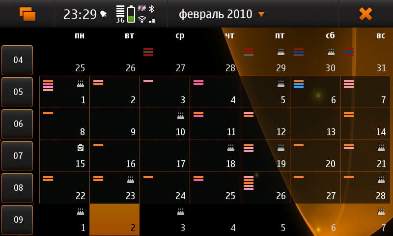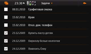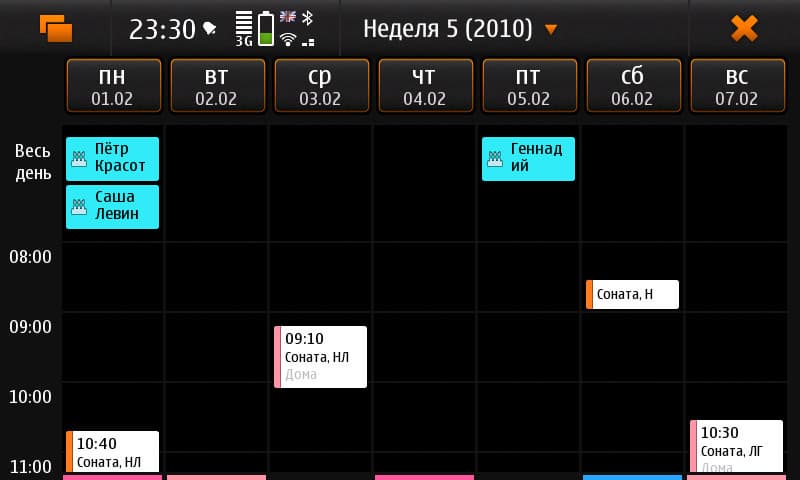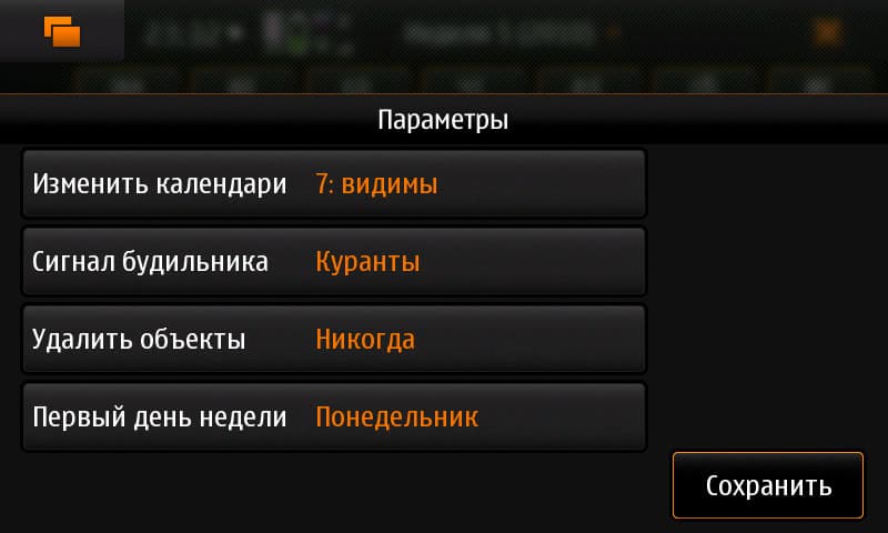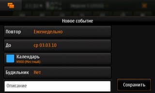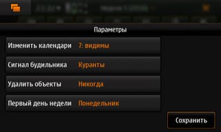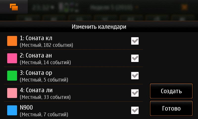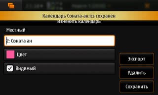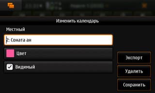 «Календарь». Начать следует с того, что календарей может быть несколько. Правда, реализовано это не так, как в Series80, где было можно создавать несколько баз данных и переключаться между ними, а чуть иначе. Внутри одного «Календаря» ведётся несколько списков, каждому из которых присваивается цветовой маркер. Можно включить или отключить отображение любых «Календарей»; для каждого работает счётчик событий. Можно сохранить выбранный «Календарь» в виде файла. По идее, можно и восстановить, но пока эта функция отваливается с сообщением «Ошибка».