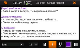 Приложения органайзера «из коробки» представлены «Календарём», «Заметками», «Калькулятором» и «Часами» с будильником. За всем остальным — добро пожаловать в репозитории. Стандартные «Заметки» неплохи, вполне себе приемлемо сделаны, но очень неудобно то, что не ведётся никакого внутреннего журнала. Поэтому сохранённые в разных местах заметки потом приходится ещё долго искать. По возможностям набора текста — несколько сильнее «Active notes» из E-серии смартфонов Nokia, но по содержанию на порядок слабее. В репозиториях есть ещё несколько приложений на выбор. Правда, до «Active notes» ни одно из них не дотягивает.