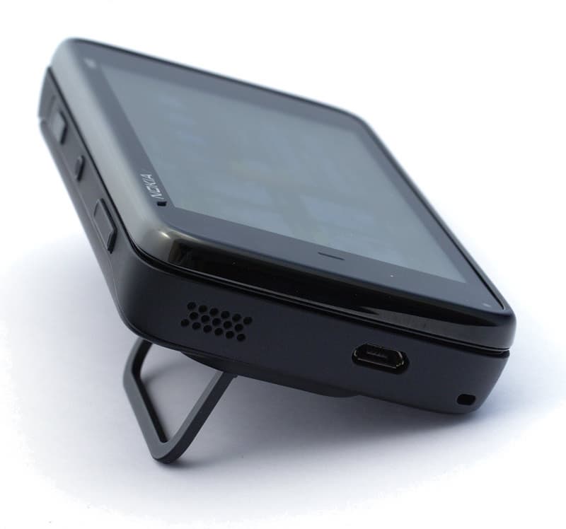 Аппаратик довольно тяжёлый (почти 200 граммов), а подставка, выполненная в виде окантовки объектива камеры, чересчур смещена влево, из-за этого устойчивость N900 практически на грани, а с открытой клавиатурой ещё хуже: нажатия на экран чем выше и правее, тем сильнее устройство качнётся. Про зарядное устройство уже было сказано выше: опять новый разъём, опять переходник с собой носить. Честно говоря, Nokia начинает уже утомлять постоянной сменой типов разъёмов.