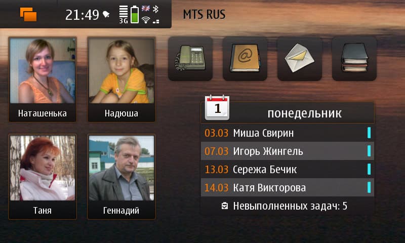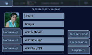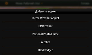 «Из коробки» наличествуют виджеты погоды (Foreca), медиаплеера, календаря, местоположения, ленты RSS-новостей, OVI-магазина и Google. Для сообщений встроенного виджета нет; пришлось ставить самостоятельно. Контакты добавляются несколько причудливо: только имя (без фамилии) и картинка. Клик по контакту — открывается визитная карточка; не радует отсутствие возможности запустить отсюда редактирование контакта. И что совсем не радует — нельзя переименовать подпись. Дело ещё и в том, что если у контакта имеется занятое поле «Псевдоним», то и на контакт рабочего стола будет вынесено именно оно, а это далеко не всегда удобно.