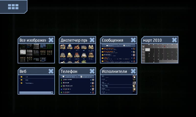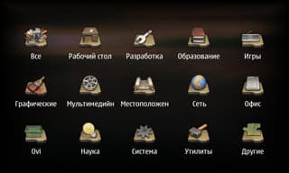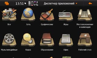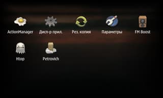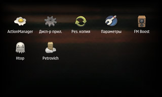 Что касается меню, оно устроено следующим образом: это сетка 5х3 иконок, из которых правая нижняя открывает второе меню, в которое складывается вообще всё остальное установленное, в результате пользоваться такой структурой при большом количестве установленных программ попросту невозможно. Менять значки местами, создавать папки — нельзя. Кое-что, опять же, немного улучшается сторонними разработками (например, catorize, mymenu), но до нормальной ситуации пока далековато. На скриншотах — меню, преобразованное программой Catorize.