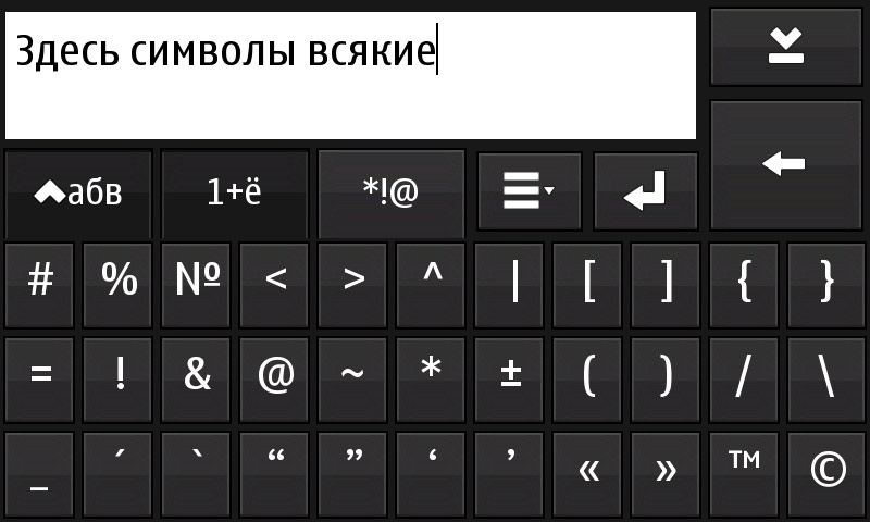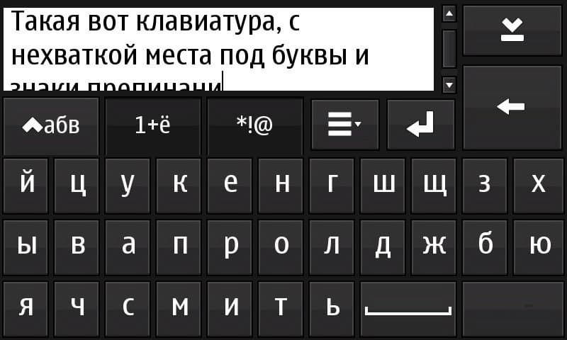 Выдвижная вполне со своими задачами справляется, но временами сильно напрягает отсутствие навигационной клавиши, т.к. опять же в нашей локализации для четырёх стрелок «вверх», «вниз», «влево» и «вправо» используются две клавиши, а не четыре. Сюда же: очень не нравится отсутствие индикации текущего метода ввода. Благо, этот вопрос с недавнего времени начал потихоньку решаться сторонними разработчиками (апплет keyboard layout для status area).