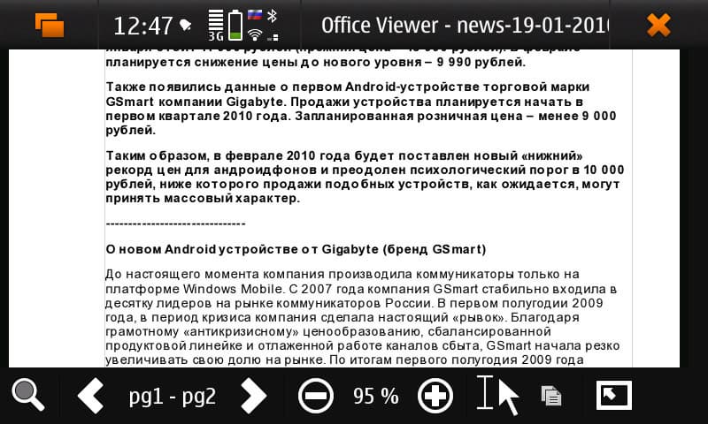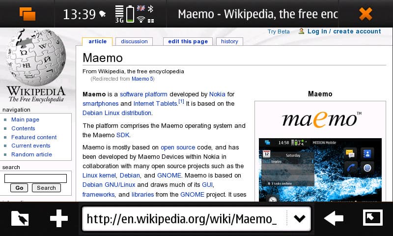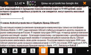 Стандартный браузер (microb) оказался весьма неплохим. Настолько, что также вполне неплохой сторонний — Mozilla Firefox (Fennech) — оказался, в общем-то, не у дел. Красиво и довольно удобно устроенная система закладок, интересно реализованный механизм включения мышки (внятно пользоваться, правда, можно только стилусом), запуск поиска в Google при наборе в адресной строки чего-то, не являющегося адресом, возможность открывать ссылки в новом окне, выделять и копировать содержимое страницы. Реализован также портретный режим; нужен, правда, не слишком часто. Умный ZOOM — двойной клик увеличивает выбранную область страницы, есть ещё круговые движения по экрану, но это не слишком удобно, страница дёргается туда-сюда.