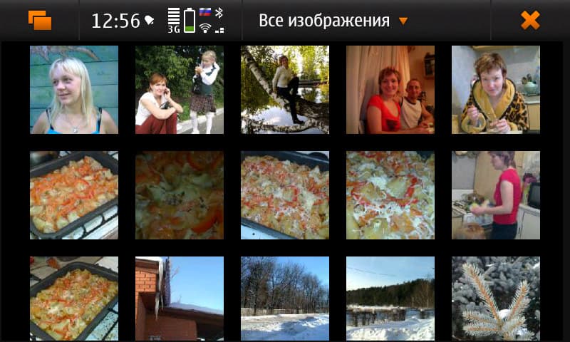 «Галерея» (здесь это приложение «Фото») — обычная нокиевская свалка всего в одну кучу. Можно, конечно, сортировать изображения по папкам, но только через меню, и делать это придётся каждый раз заново, т.к. по умолчанию открывается сортировка «Все фотографии», и изменить это нельзя. Просмотр изображений на порядок удобнее, чем в, скажем, Nokia 5800, удобнее, быстрее. Пролистывание и поворот картинки уже почти как в iPhone.