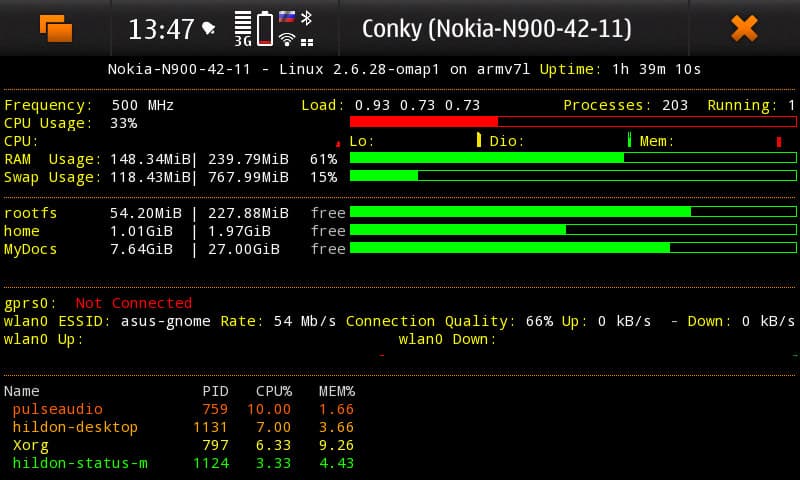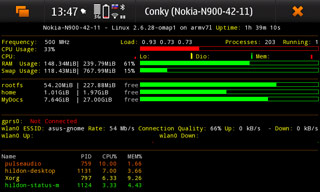 В целом быстродействие системы можно считать удовлетворительным. Так сказать, на грани: чуть медленнее, и уже появились бы негативные впечатления. Уже бытует мнение, что, дескать, сколько задач ни запусти на N900, а ему всё по барабану, всё так же быстр и ловок. Беда в том, что большинство таких запущенных приложений ничего не делают: висят себе в swap'е, и процессор/память/флеш не напрягают. А вот вы запустите MC и копирование файла по WiFi с настольного ПК, запустите Maemo Mapper, Htop и Conky. И увидите, что «Книга контактов» открывается уже далеко не так уверенно, не говоря уже о скорости сохранения отредактированного контакта. Да что далеко за примером ходить: включаем появившийся сторонний эквалайзер, и вуаля: вот они, тормоза во всей красе.