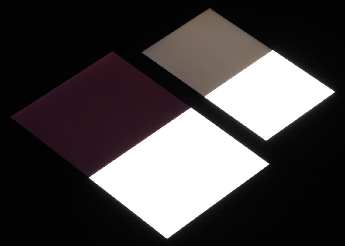 Яркость под углом у экранов уменьшилась, но у OnePlus 2 экран под этим углом все же светлее. Черное поле при отклонении по диагонали высветляется сильно и приобретает легкий красно-фиолетовый оттенок. Фотографии ниже это демонстрируют (яркость белых участков в перпендикулярном плоскости экранов направлении одинаковая!):