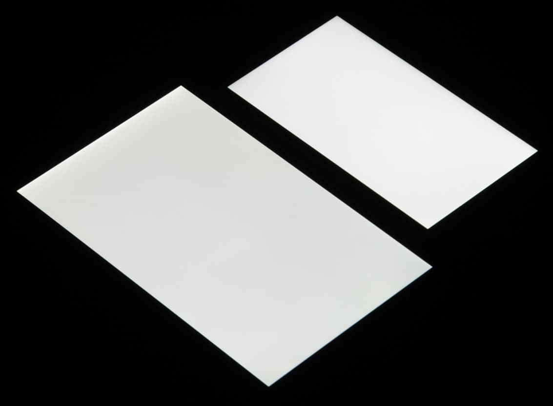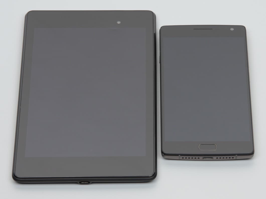 Лицевая поверхность экрана выполнена в виде стеклянной пластины с зеркально-гладкой поверхностью, устойчивой к появлению царапин. Судя по отражению объектов антибликовые свойства экрана не хуже, чем у экрана Google Nexus 7 (2013) (далее просто Nexus 7). Для наглядности приведем фотографию, на которой в выключенных экранах отражается белая поверхность (слева — Nexus 7, справа — OnePlus 2, далее их можно различать по размеру):