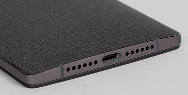 Динамик здесь не выведен на заднюю сторону корпуса — звук выходит через прорези в нижнем торце. Там оборудовано два ряда крупных круглых отверстий, симметрично расположенных по обе стороны от разъема питания, но, как водится, лишь сквозь один из них проходит звук, а за вторым, очевидно, скрывается разговорный микрофон (или он вовсе служит лишь для бутафории). В качестве USB-разъема здесь использован USB Type-C, так что запасливым пользователям придется менять купленные ранее дополнительные аксессуары с разъемом Micro-USB на новые. А вот режим подключения периферии USB OTG этот разъем, вопреки обещаниям компании, так и не поддерживает, хотя галочка включения режима в настройках имеется.