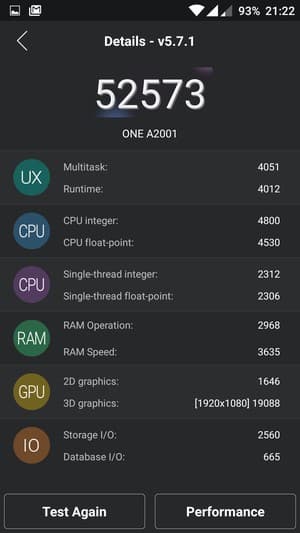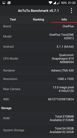 В ходе тестирования мощный процессор вкупе с четырьмя гигабайтами оперативной памяти и производительным видеоускорителем выдали весьма впечатляющие результаты. Если судить по данным популярного бенчмарка AnTuTu, это около 52К в 32-битном и примерно 55К в 64-битном тестах; остальные тесты также демонстрируют значения, близкие к максимальным. Все это позволяет говорить о OnePlus 2 как об одном из самых производительных современных смартфонов, а о Snapdragon 810 — как об истинно флагманской платформе, не уступающей конкурирующим топовым решениям MediaTek Helio X10 и Samsung Exynos 7420.