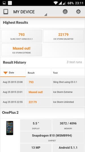 В любом случае аппаратная начинка смартфона OnePlus 2 достаточно производительна для того, чтобы справиться с любыми задачами, поставленными самыми требовательными современными программами и тяжелыми 3D-играми. В этом плане смартфон еще долго будет оставаться актуален.