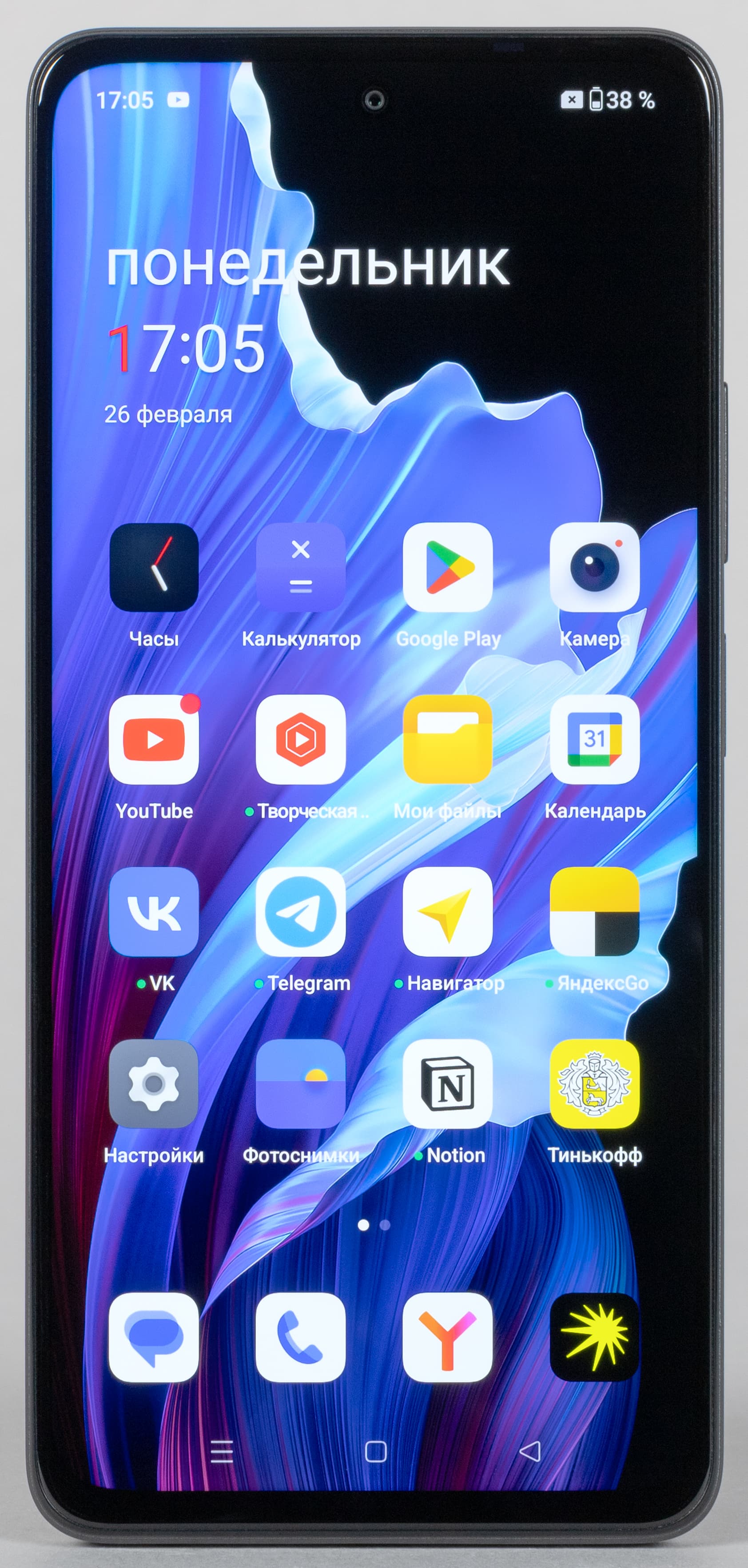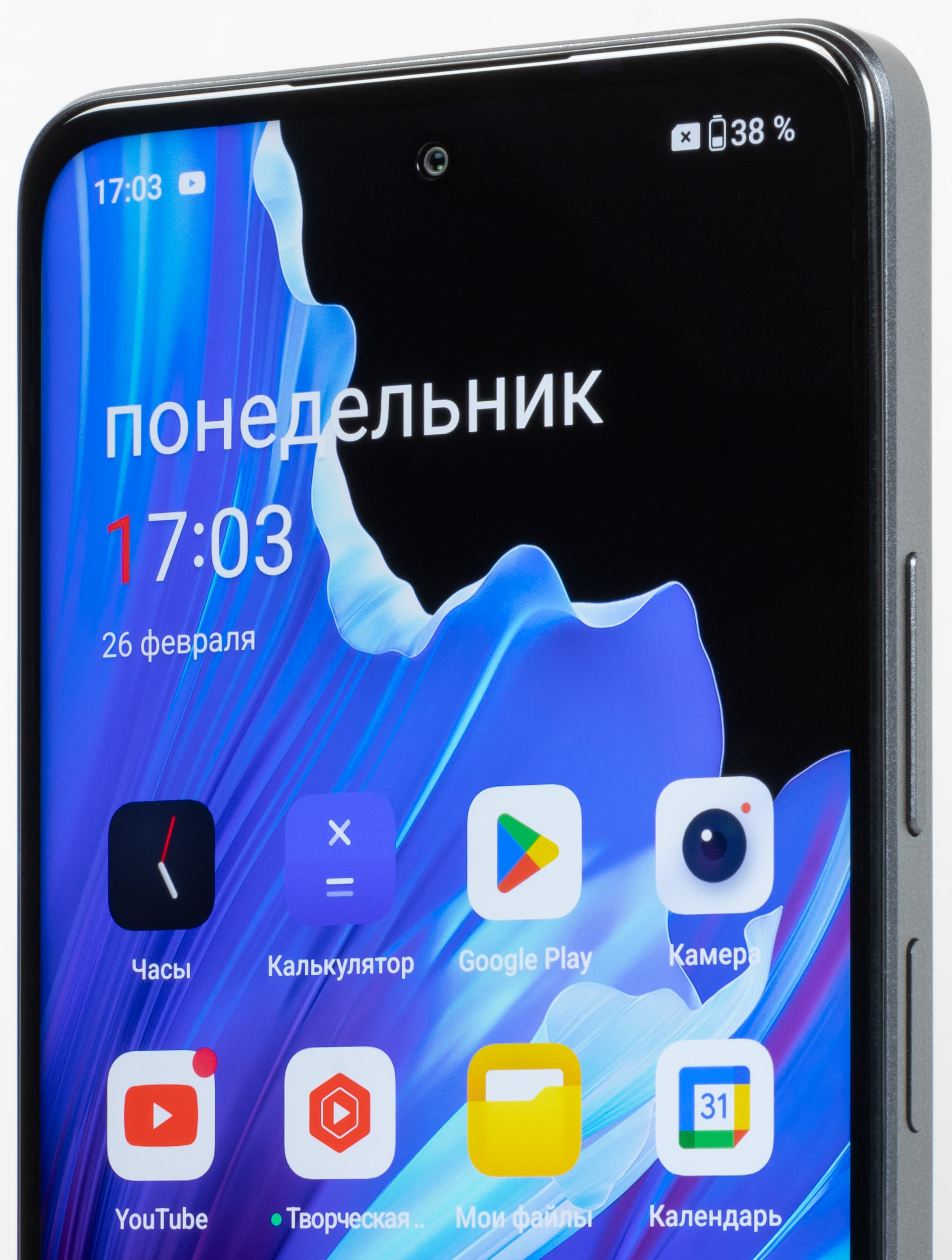 Фронтальная камера одиночная и установлена за круглым вырезом в матрице экрана сверху по центру.