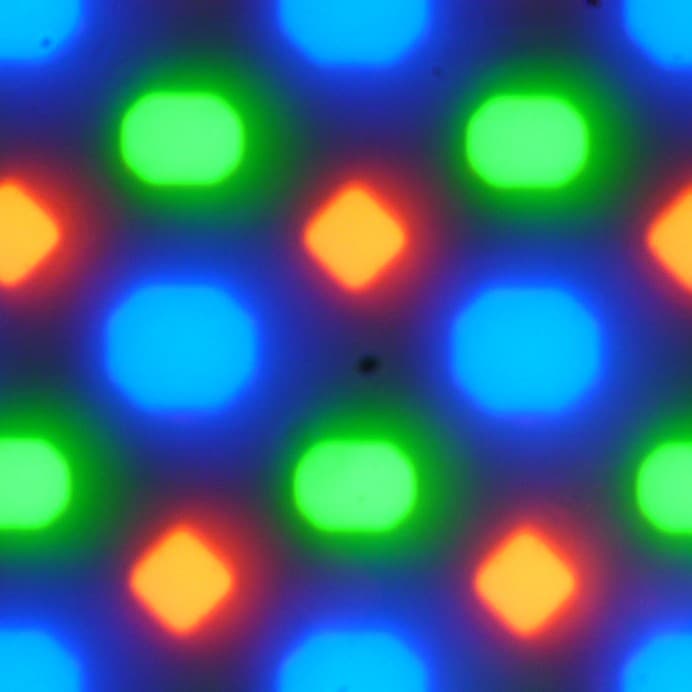 В этом экране используется OLED-матрица — активная матрица на органических светодиодах. Полноцветное изображение создается с помощью субпикселей трех цветов — красного (R), зеленого (G) и синего (B) в равном количестве, что подтверждается фрагментом микрофотографии:
